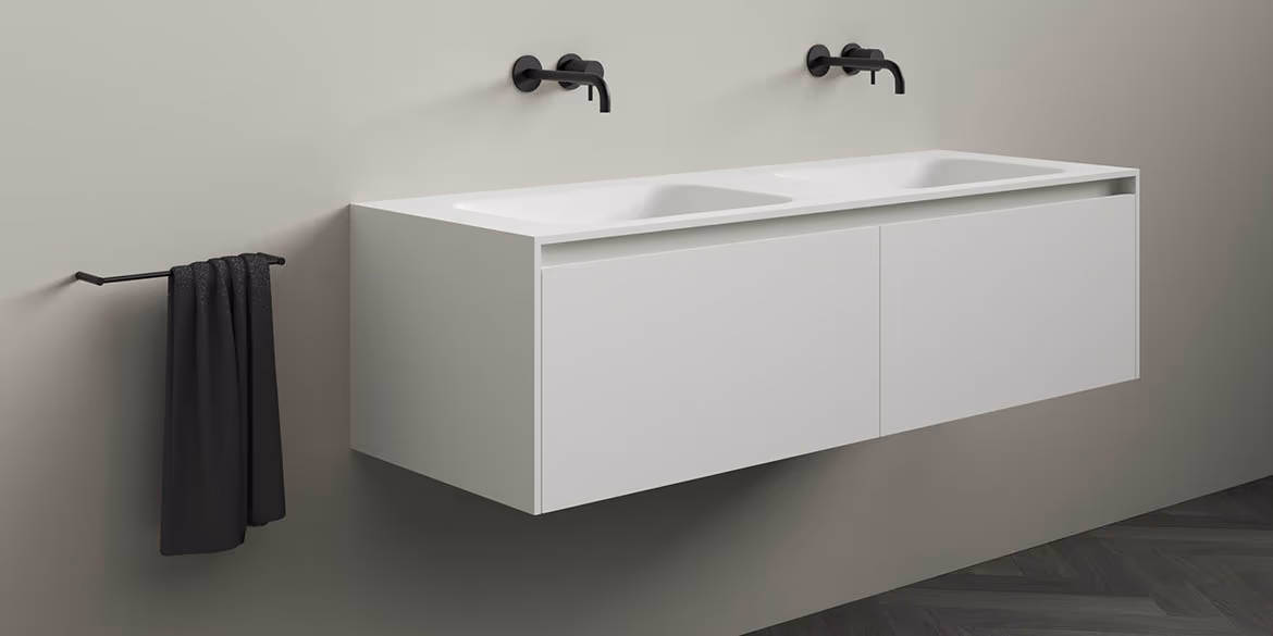 Het B DUTCH Juve Greep badkamermeubel 1500 is 150 cm breed, 47,5 cm diep en 40 cm hoog. Het wastafelmeubel bestaat uit de combinatie van een B DUTCH Juve Greep wastafelonderkast van 150 cm breed en een B DUTCH Barbados Double Solid Surface Corian wastafel Glacier White, mat wit, van 150 cm breed met twee wasbakken in het midden gecentreerd. De wastafelonderkast, het ondermeubel, is eveneens gemaakt van Solid Surface Corian Glacier White. Het Corian materiaal is van zeer hoogwaardige kwaliteit en vergeelt niet.