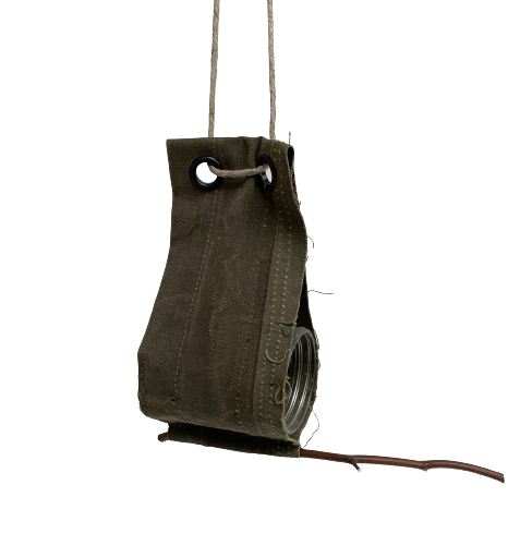 Handgemaakt vogelvoederhanger van legertentstof. Met ophangtouw om aan een tak van de boom of onder de veranda te hangen. Vul het met een pot ‘pindakaas’vogelvoer en de koolmees, mussen en roodborstjes komen smullen.