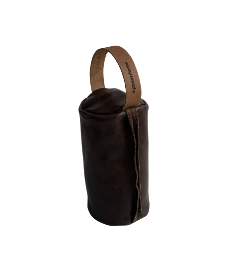 Stoere, stevige leren deurstopper. Made BY Zitiz.nl. Binnenin zit een zakje gevuld met fijn zand voor het gewicht. De deurstopper weegt ca 2,5 -3 kg. Een mooi product dat je deur zonder beschadiging open of dicht houdt. De deurstopper is onder andere verkrijgbaar in zwart, zand, cognac en donkerbruin. Wil je een andere kleur, kies dan bij Opties “andere kleur namelijk” en vul bij Notities van de bestelling de kleur in die je wenst.