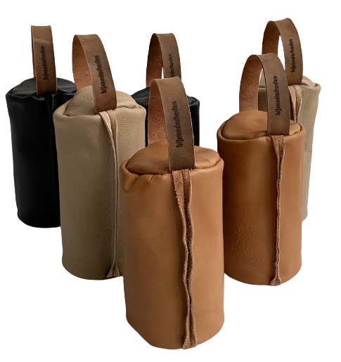 Materiaal: leer, binnenzak gevuld met zand, leren handvat