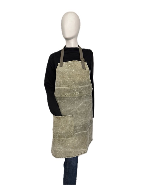 Stoer schort gemaakt van een oude legertent. Kan tegen een stootje. Geschikt voor koken, schilderen of beeldhouwen. En natuurlijk voor de barbeque. Met zakje en verstelbare nekband.