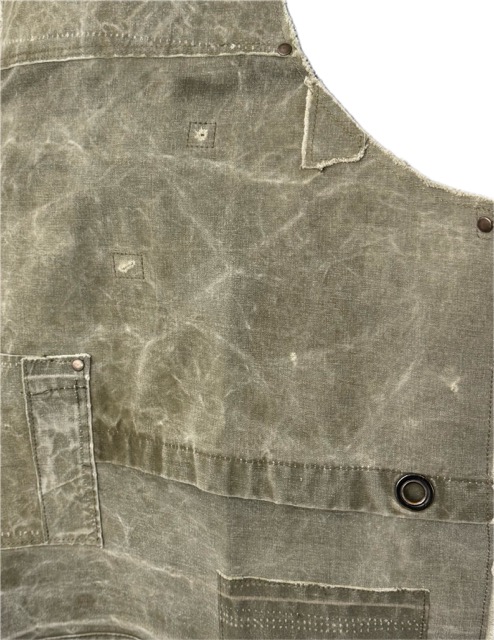 Stoer schort gemaakt van een oude legertent. Kan tegen een stootje. Geschikt voor koken, schilderen of beeldhouwen. En natuurlijk voor de barbeque. Met zakje en verstelbare nekband.