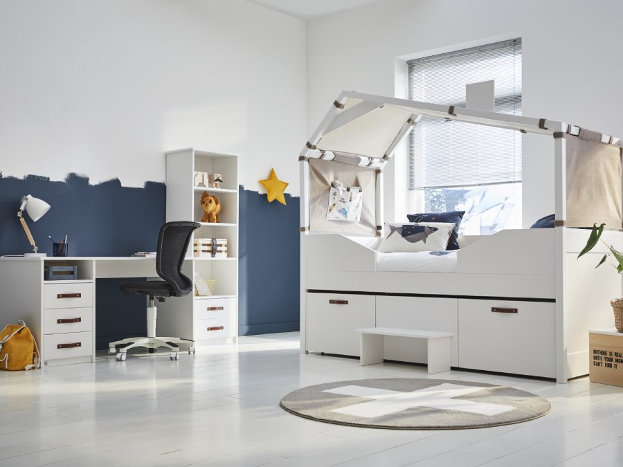 Dit bed is beschikbaar in verschillende varianten. Er zijn verschillende hoogtes beschikbaar waardoor er andere lades onder kunnen. Dit is de hoogste variant. Ook past er op dit bed een tipi of hut dak. Hierdoor kun je er een super leuk huisbed in thema van maken. Bekijk hier alle Cool Kids bedden.
