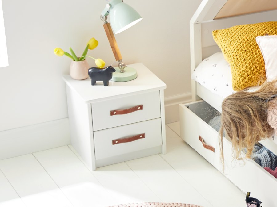 Een nachtkastje is natuurlijk een musthave in de kamer van jullie kind. Hier kan een wekker, nachtlampje en/of boek worden gelegd. Dit Cool Kids nachtkastje heeft twee lades welke voorzien van een leren handgreep. Stoer en echt van deze tijd.
