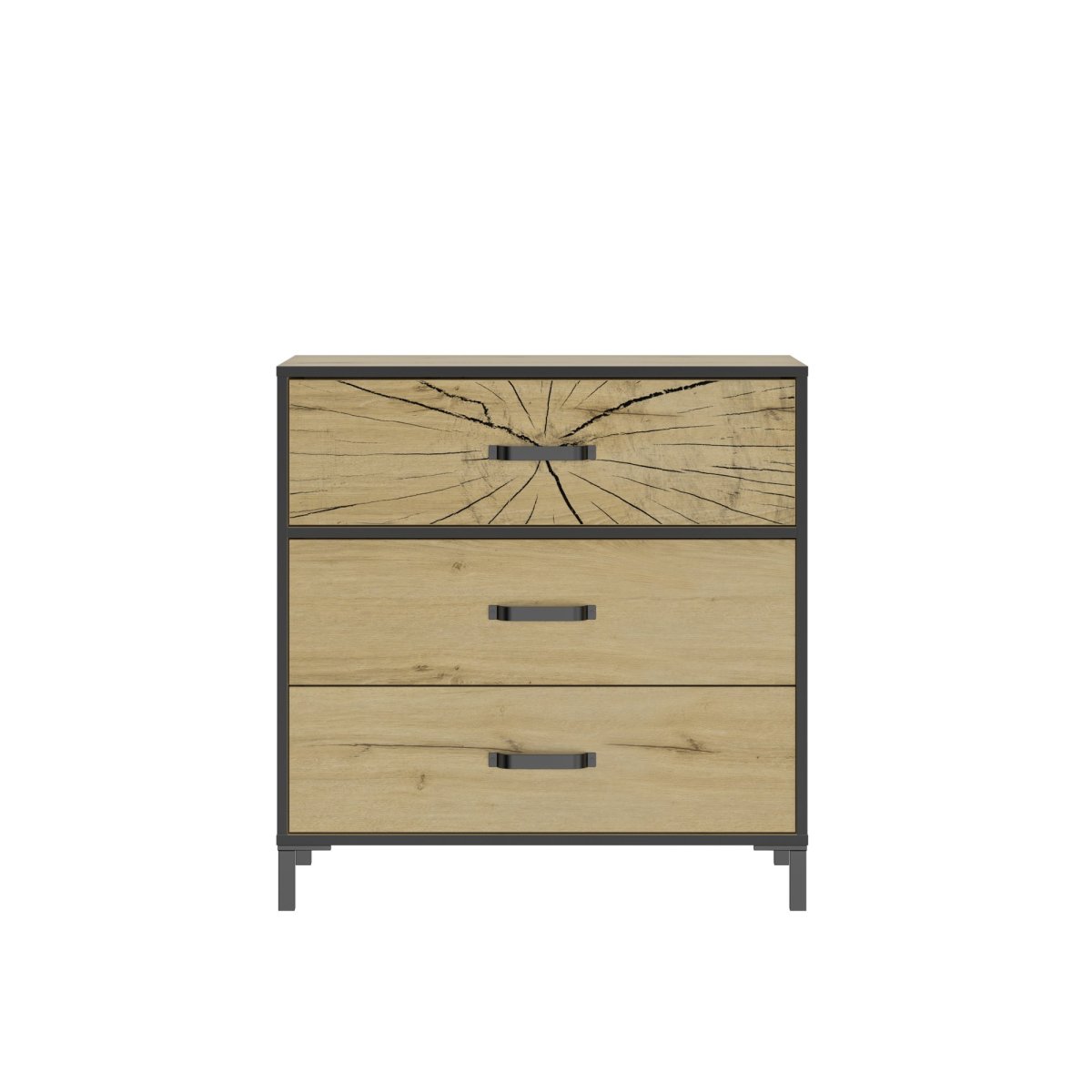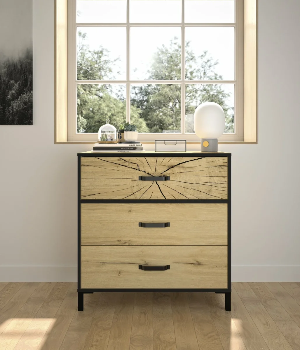 Ontdek nu de Diagone ARMOR 3-ladenkast, een meesterwerk uit Frankrijk dat de natuur naar je slaapkamer brengt. De ladekast is rijkelijk versierd met een prachtige “gekapte boomstam” print op de bovenste lade, waardoor het een unieke en authentieke uitstraling krijgt. De combinatie van zwarte ABS poten en handgrepen voegt een vleugje eigentijdse moderniteit toe aan dit meubelstuk.