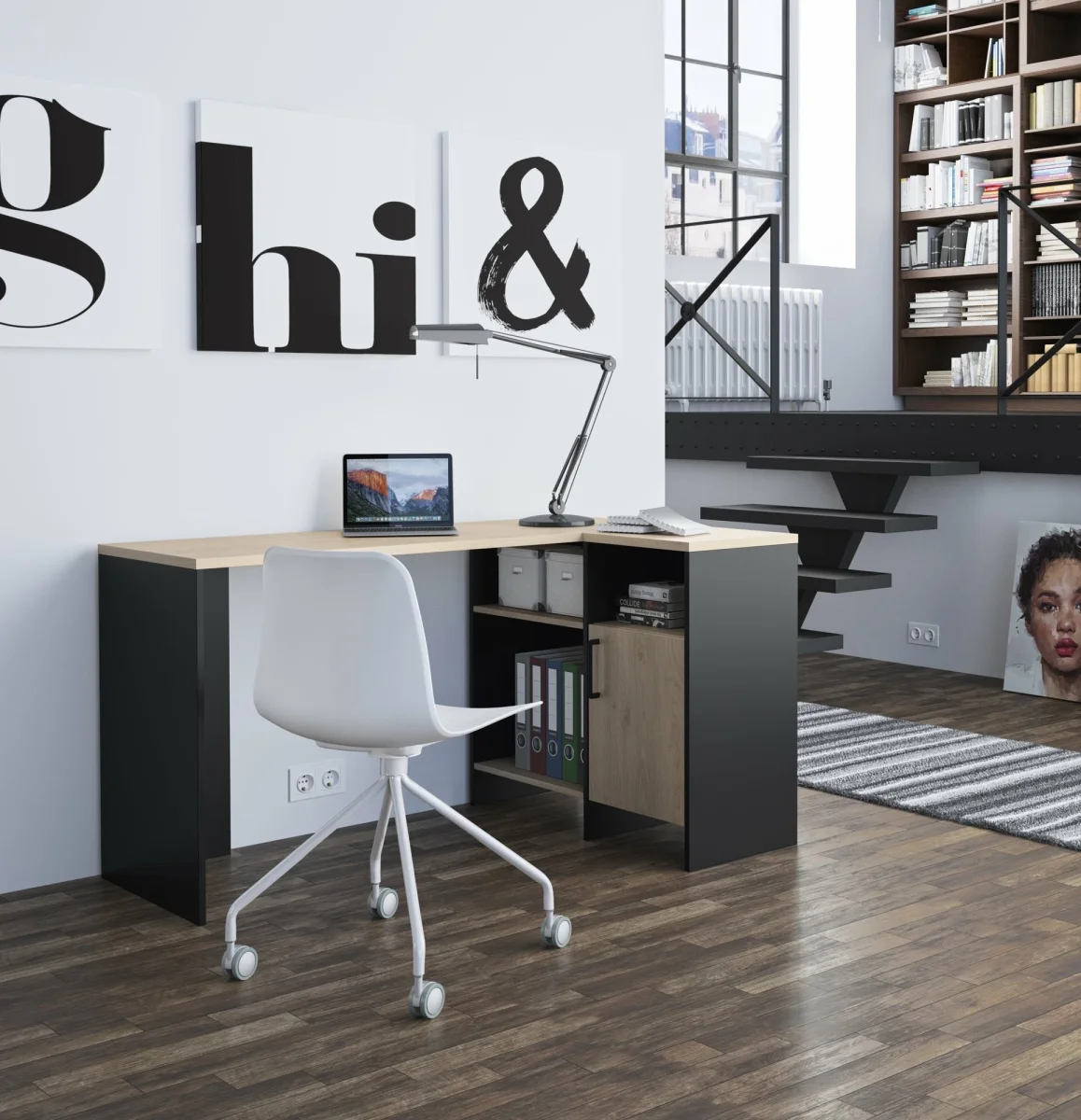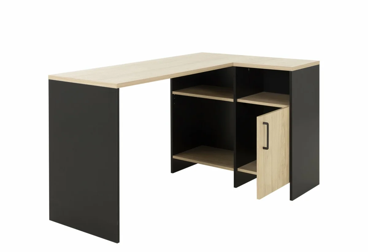 Ontdek het hoekbureau LIVERPOOL in de kleurcombinatie zwart/houtlook, een hoogwaardig meubelstuk vervaardigd in Frankrijk. Met zijn ruime werkblad en rechterzijde biedt het een comfortabele werkruimte voor al jouw professionele of persoonlijke activiteiten.