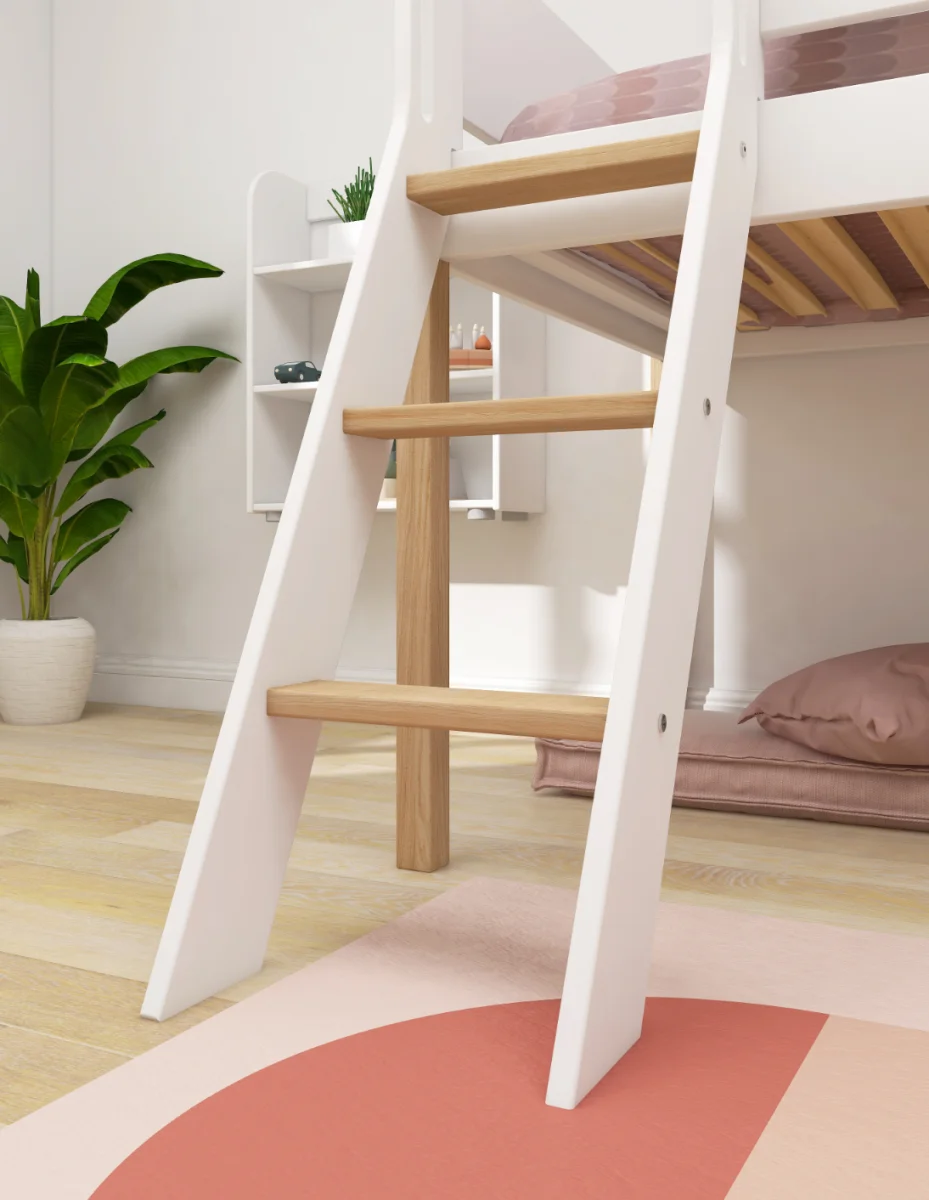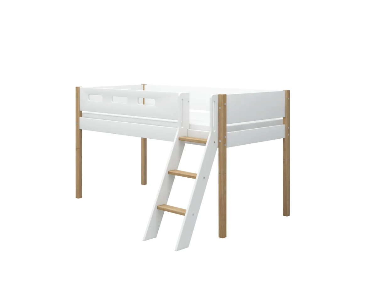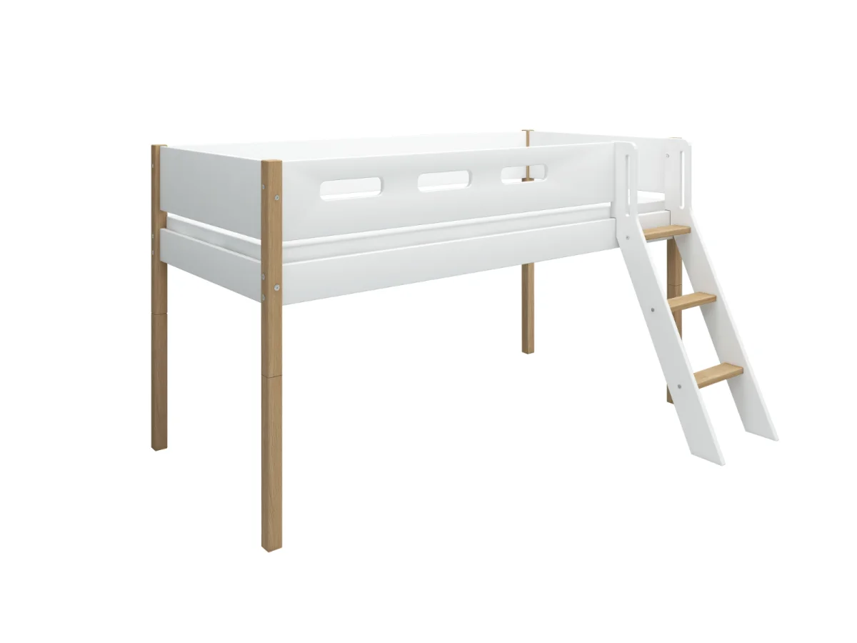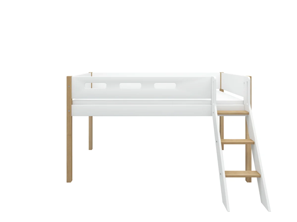 Ontdek de Flexa Nor halfhoogslaper met schuine ladder en uitvalbeveiliging. De ladder heeft anti-sliptreden en geïntegreerde handgrepen en kan aan beide uiteinden van het bed geplaatst worden.Het bed is gemaakt van hoogwaardig MDF en heeft poten van massief eikenhout. Een sterke lattenbodem is inbegrepen. Een matras kun je mee bestellen indien gewenst.