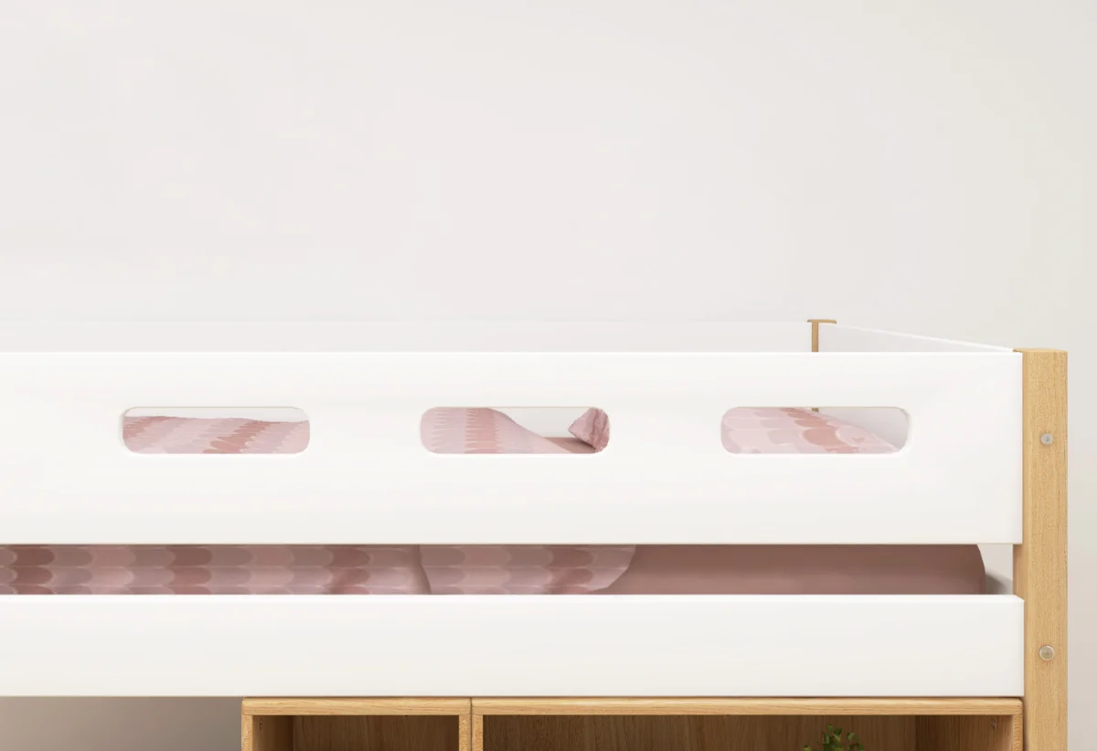 De ruimte onder de halfhoogslaper is geschikt als opbergruimte en kan gecombineerd worden met opbergoplossingen uit de collecties Popsicle en Roomie. Met het textiel van Flexa kun je een privéplekje onder het bed creëren door een speelgordijn toe te voegen.