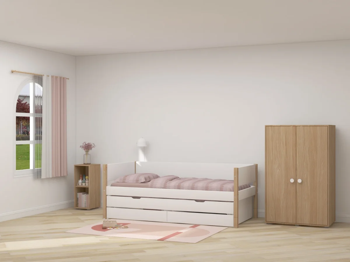 Deze smalle boekenkast van Flexa past goed bij de Nor en Popsicles collectie van het merk. Het mooie is dat hij precies onder de halfhoogslapers past. Zo kun je de ruimte onder het bed dus goed benutten. De kast is gemaakt van MDF met eikenfineer.
