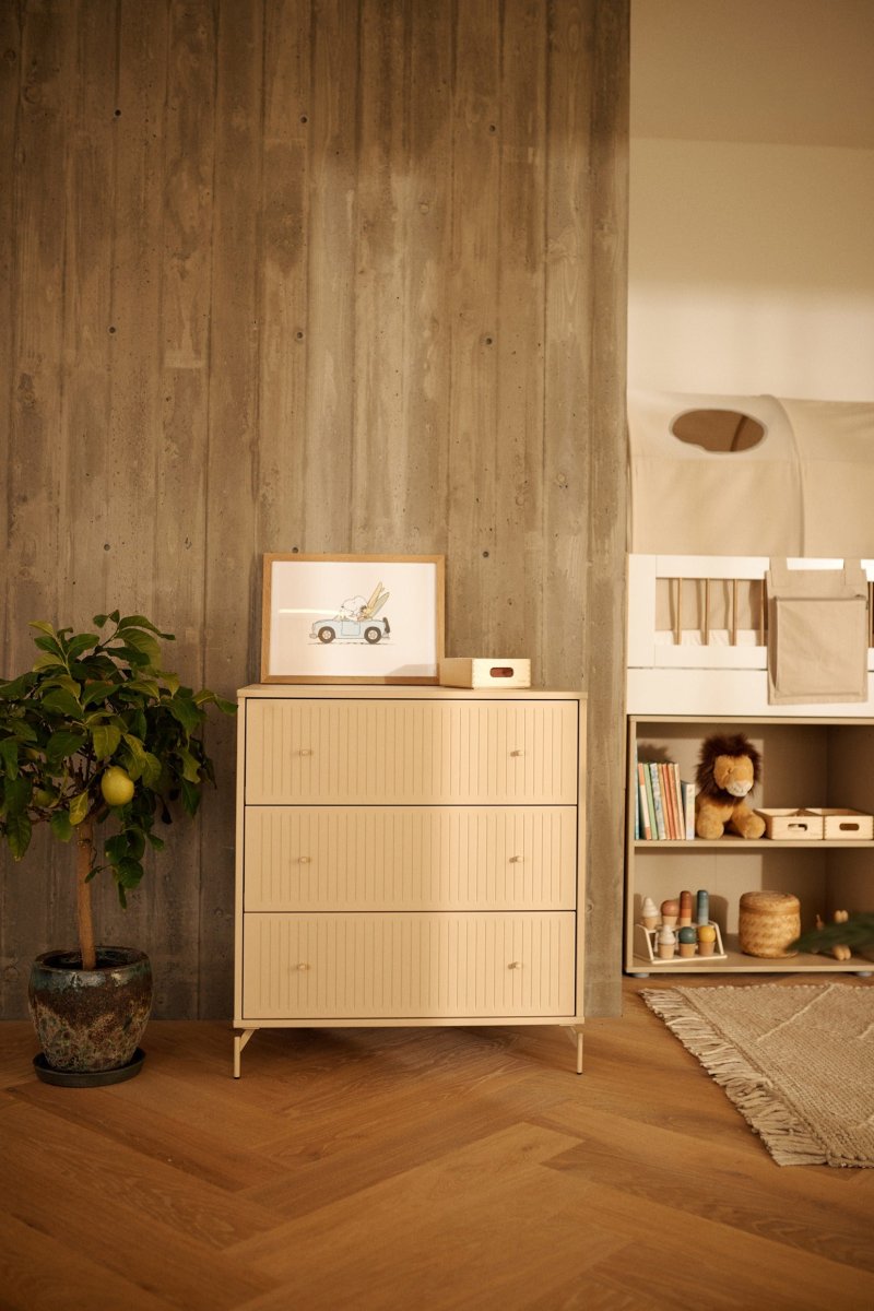 De Saga Opbergcollectie is geïnspireerd op de ongerepte natuur van de Deense westkust, waar het zachte, zandige kleurenpalet de tinten van de kust weerspiegelt, terwijl de gegroefde details de organische lijnen van windgeslagen duinen vastleggen. Saga Opberging biedt een tijdloos ontwerp dat naadloos aansluit op onze bestaande bedsystemen en zorgt voor een harmonieus geheel in elke kinderkamer.