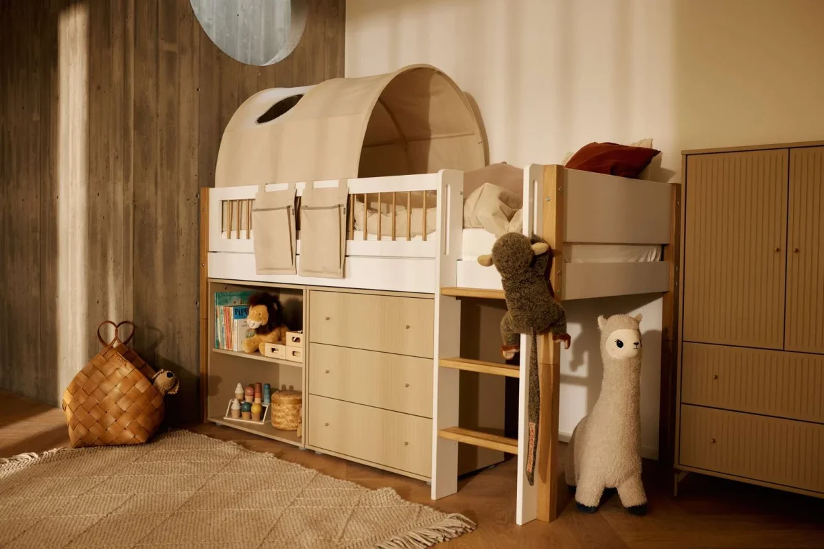 De Saga-opslagcollectie is geïnspireerd door de ongerepte natuur van de Deense westkust. De gegroefde details in de fronten vangen elegant de organische lijnen van door de wind gevormde duinen. Het tijdloze ontwerp van de collectie past naadloos bij onze bestaande bedsystemen en creëert een harmonieus geheel in de kinderkamer.