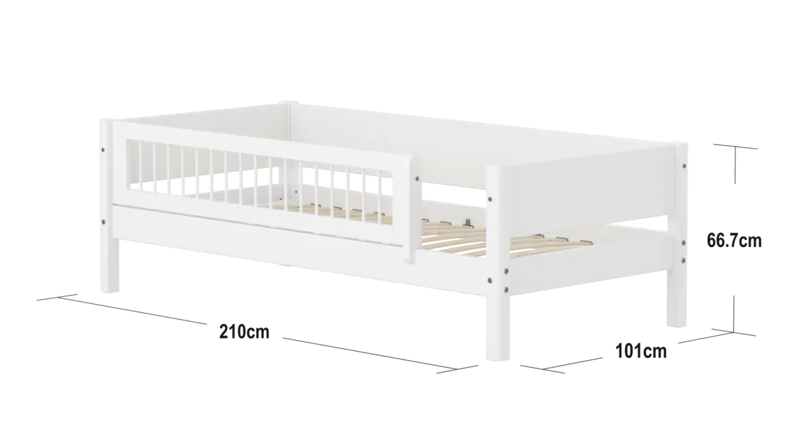 De uitvalbeveiliging is verkrijgbaar in verschillende varianten, zodat je kunt kiezen wat het beste bij de kamer van je kind past. Bovendien kun je lades met zachte rubberen wieltjes onder de bedbank plaatsen, zodat je kind zijn/haar favoriete speelgoed gemakkelijk kan opbergen en ruimte kan besparen. Een lattenbodem is standaard inbegrepen en een matras van 90×200 kun je gemakkelijk meebestellen.