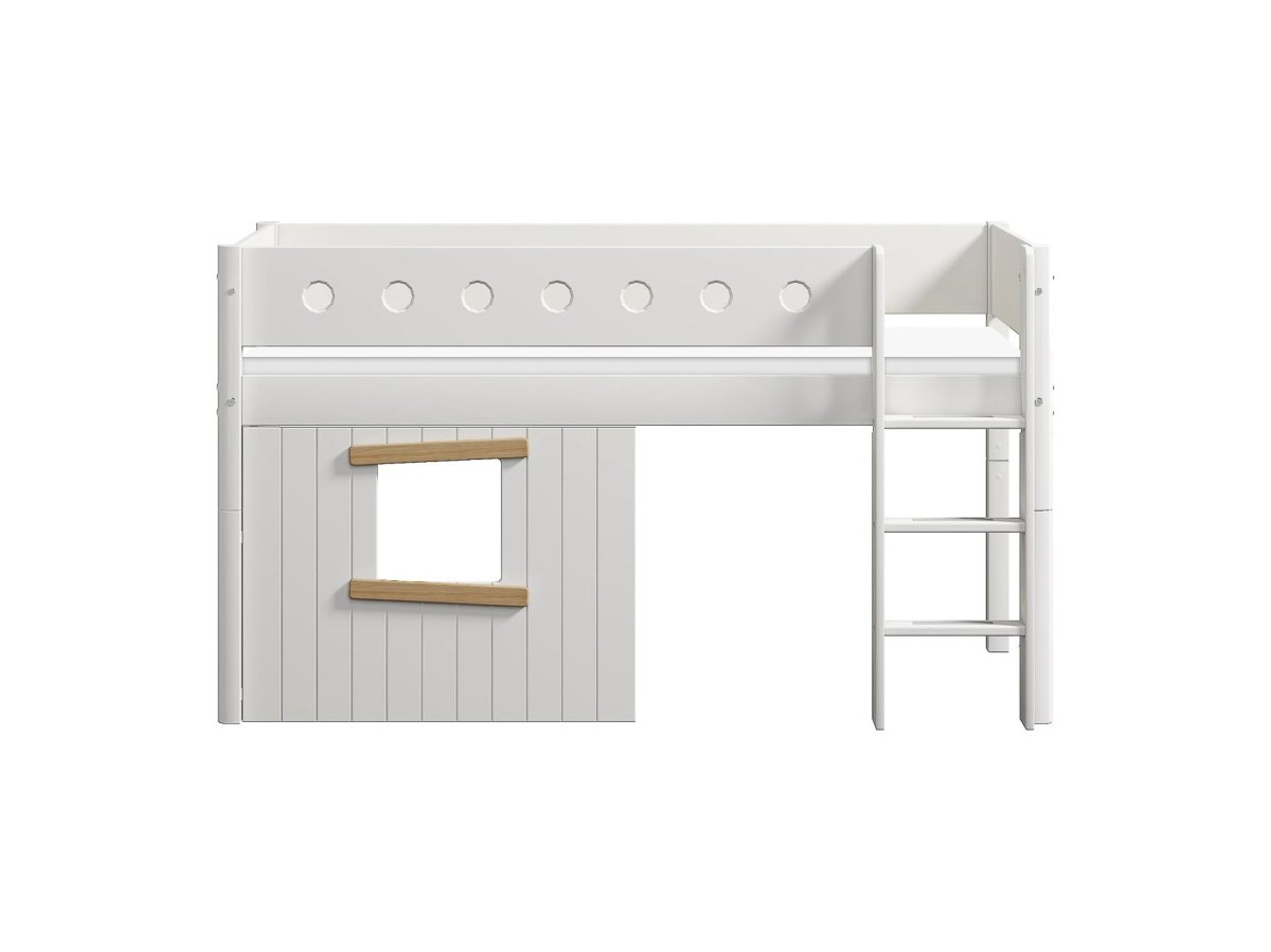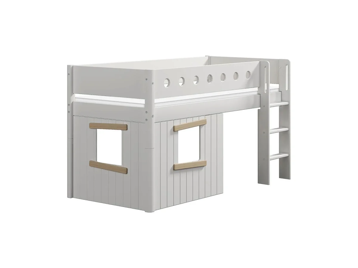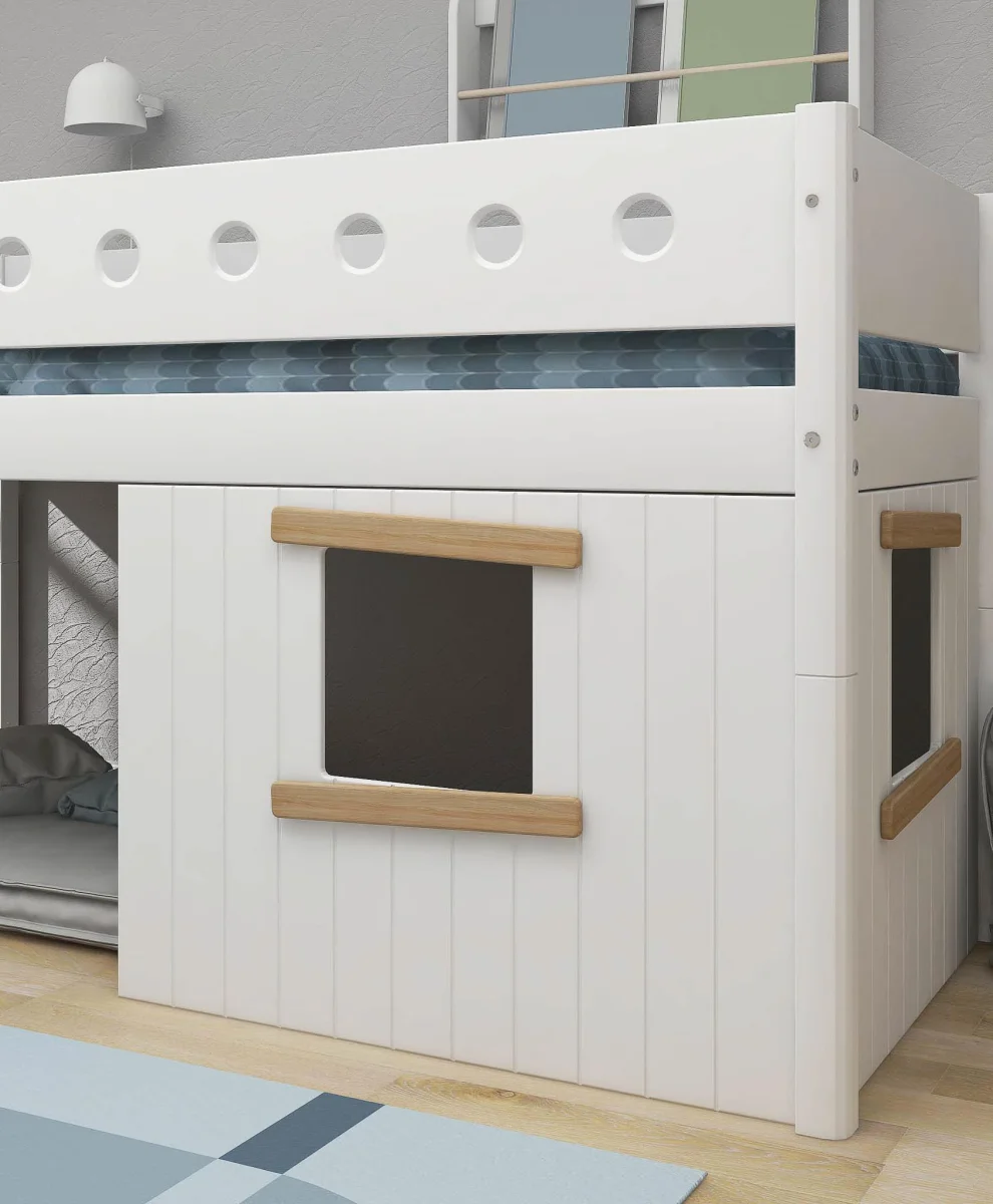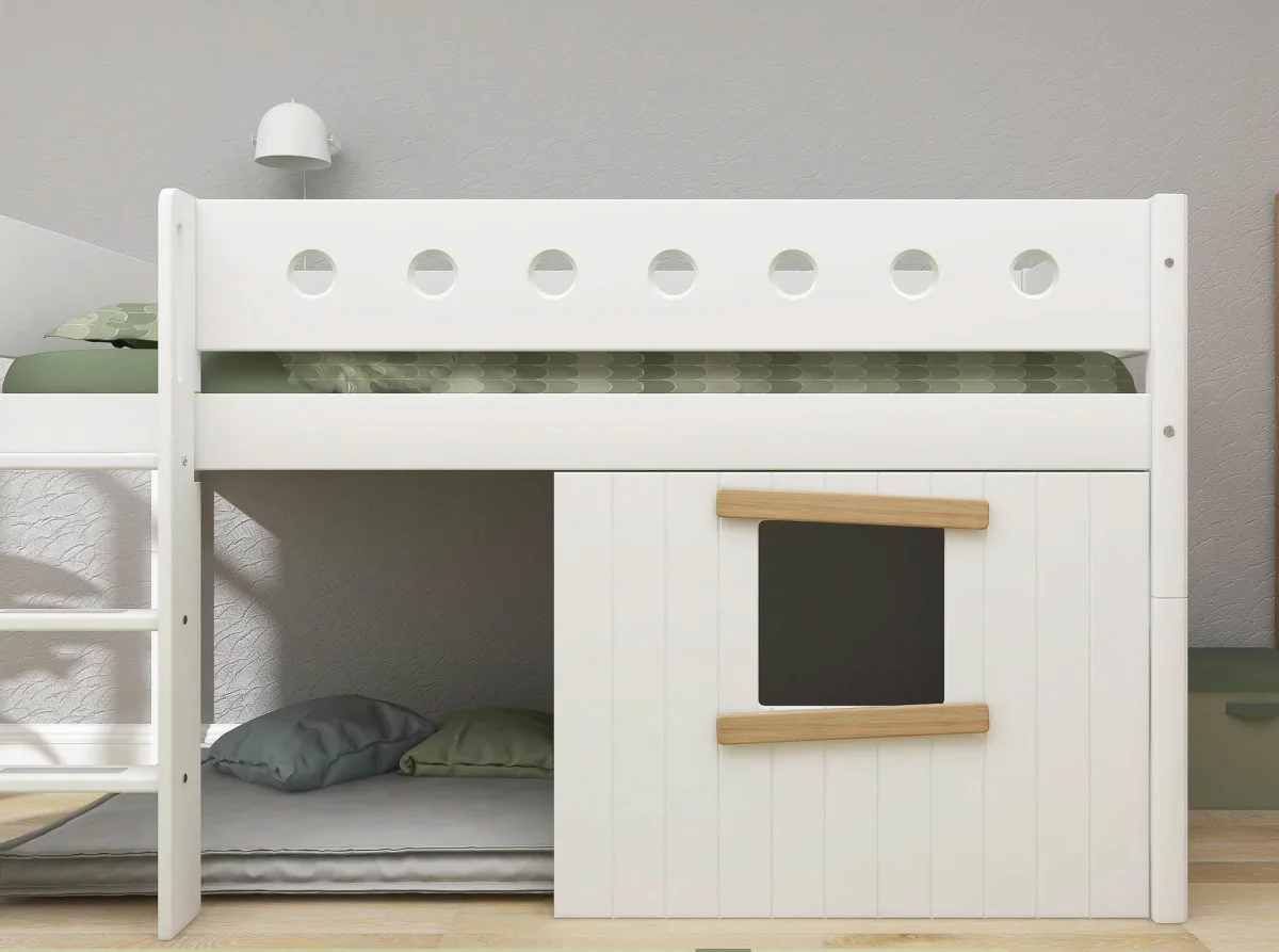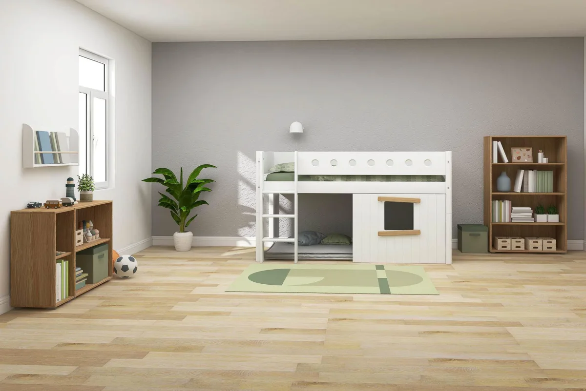 De Flexa Boomhut halfhoogslaper is speciaal ontworpen om tegemoet te komen aan de slaap-, speel- en ontwikkelingsbehoeften van je kind – alles in één bed. Met een uitvalbeveiliging en een rechte ladder voorzien van anti-sliptreden en geïntegreerde handgrepen, zorgt dit bed ervoor dat je kind altijd veilig en comfortabel kan spelen en slapen. De ladder kan aan beide uiteinden van het bed worden geplaatst. Er is ook een variant beschikbaar met een schuine ladder, waardoor het in- en uitstappen nog makkelijker wordt.