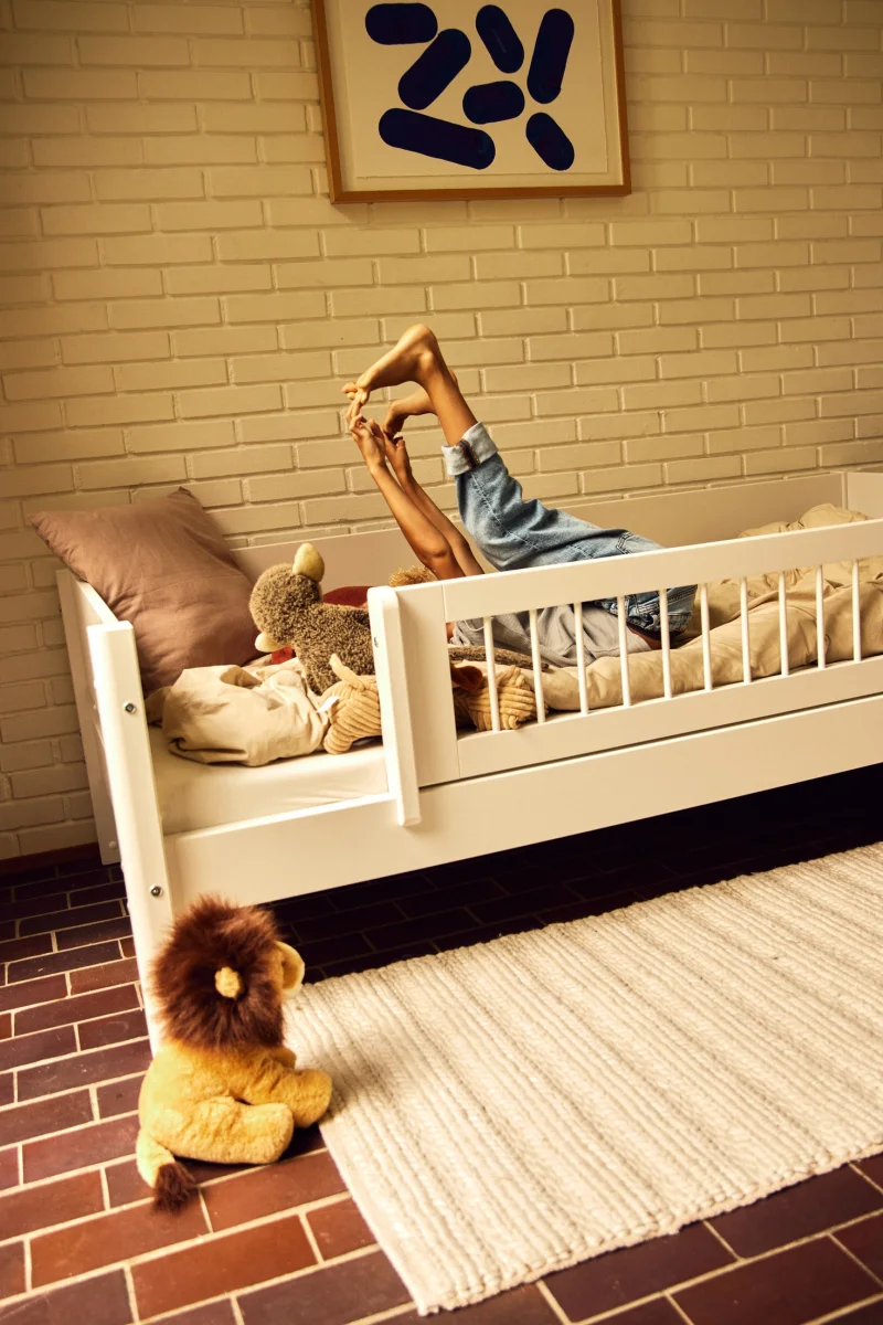 De ruimte onder de halfhoogslaper is ideaal als opberg- of speelruimte. Met het textiel van Flexa kun je een knus privéplekje creëren onder het bed door een speelgordijn toe te voegen.
