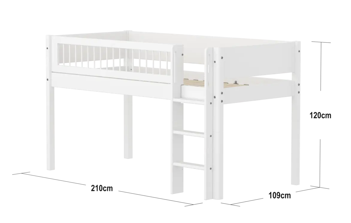 Ontdek de Flexa White halfhoogslaper met een rechte ladder en een Crossbars uitvalbeveiliging, speciaal ontworpen voor kinderen. De ladder is voorzien van anti-sliptreden en geïntegreerde handgrepen en kan aan beide uiteinden van het bed worden geplaatst voor maximale flexibiliteit.