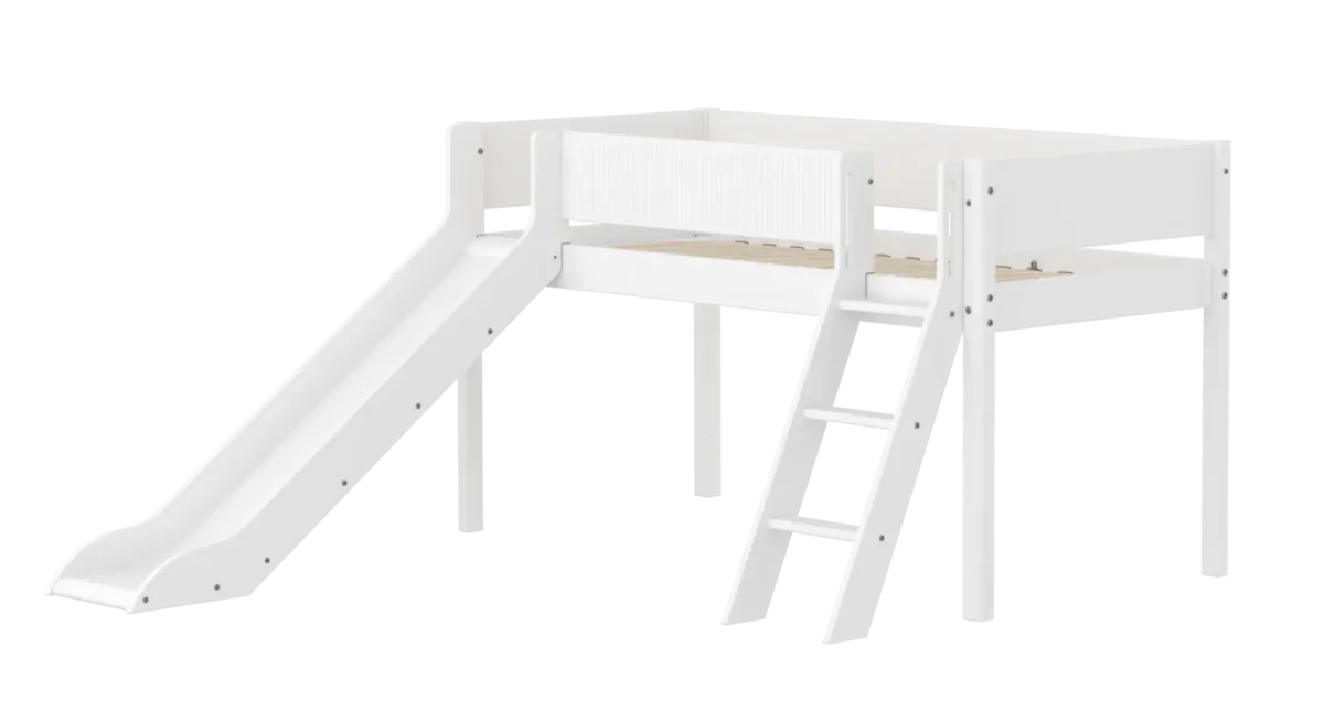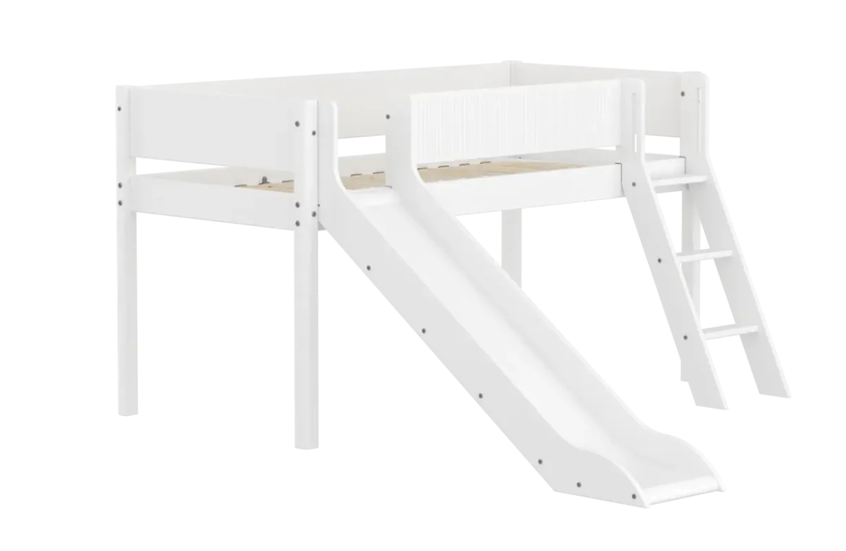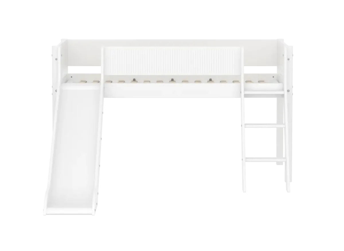 Maak kennis met de veelzijdige Flexa White halfhoogslaper met schuine ladder en glijbaan – een bed dat de kinderkamer transformeert tot een speelparadijs
