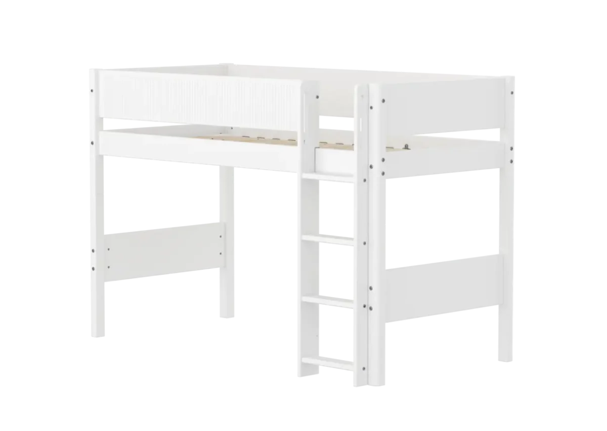 Maak kennis met de Flexa White verhoogde halfhoogslaper met rechte ladder – dit bed is maar liefst 23 cm hoger dan de gewone halfhoogslaper, waardoor er meer ruimte ontstaat om te spelen of spulletjes op te bergen onder het bed.