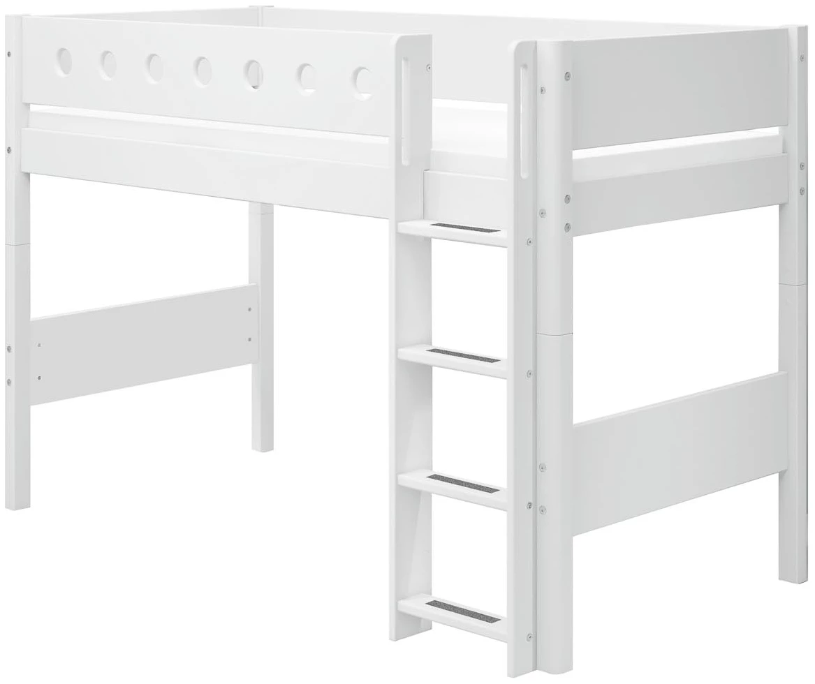 Maak kennis met de Flexa White verhoogde halfhoogslaper met rechte ladder – dit bed is maar liefst 23 cm hoger dan de gewone halfhoogslaper, waardoor er meer ruimte ontstaat om te spelen of spulletjes op te bergen onder het bed.