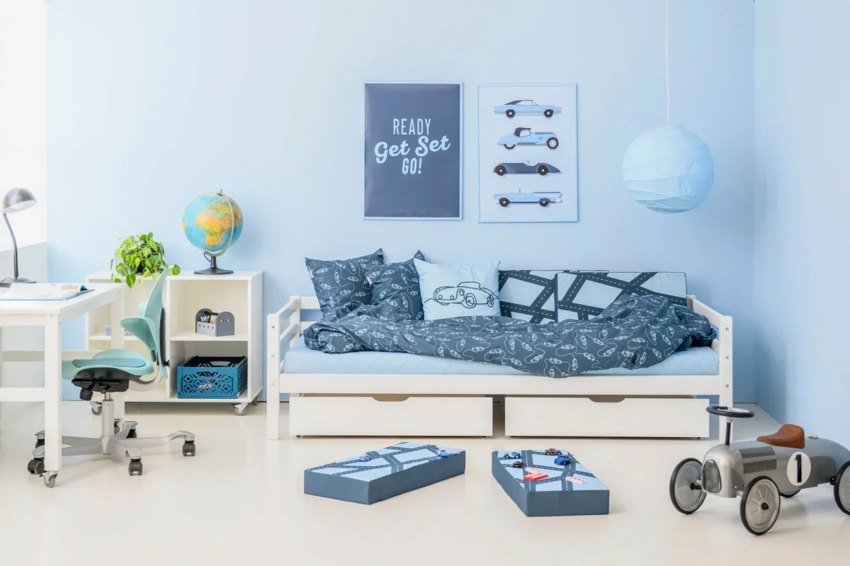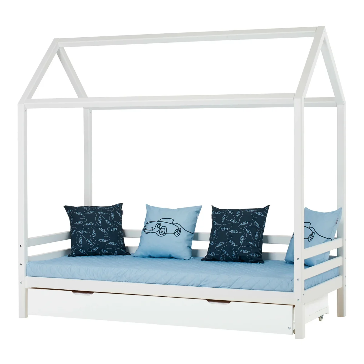 Met het decoratieve kussen van HOPPEKIDS CARS in DREAM BLUE wordt de kinderkamer veel comfortabeler! Het draagt het belangrijkste CARS designelement en past perfect bij de andere accessoires in de CARS serie. Je zult versteld staan van de mogelijke toepassingen die je kinderen zullen vinden. Als rugleuning tijdens het lezen, als zitkussen voor comfortabel spelen op de vloer, voor een kussengevecht en natuurlijk als bouwsteen voor je eigen fort! Er zijn geen grenzen aan de creativiteit van je kinderen. Het is het beste om de verschillende patronen en mogelijkheden te combineren voor variatie in de kinderkamer. De kussens zijn 50x50cm en ongeveer 15cm dik. De hoes is afneembaar en wasbaar op 30°C. Mooie, moderne tinten blauw zorgen voor een ton-sur-ton kleurbeleving. Het motief, getekend zonder onderbreking, is een echte blikvanger en vervult elke autoliefhebber met vreugde. CARS is de nieuwe collectie voor iedereen die iets eenvoudigs en ingetogens wil, maar toch niet wil afzien van speels, stijlvol ontwerp. “Het is absoluut trendy om te werken met eenvoudige grafische patronen. De kleur heeft een grote invloed op het totale effect,” legt Susanne Nielsen van het designteam uit. Het lichtblauw van de gordijnen en dekens, het donkerdere blauw van het beddengoed, en de mix van kleuren voor kussens en wimpels zorgen voor een geweldige kleurbeleving in de kinderkamer.