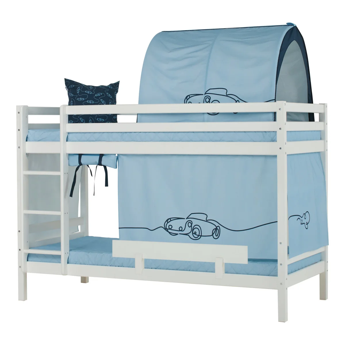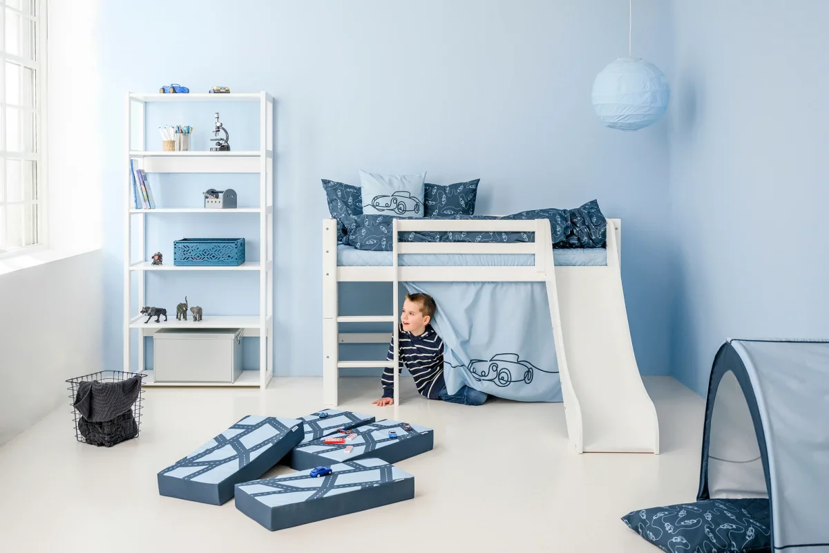 De speel- en bedtunnels van HOPPEKIDS kunnen flexibel worden gebruikt. Ofwel in bed als een kleine grot om te verstoppen en zich veilig te voelen, of als een praktische speeltunnel. Dankzij de stabiele vloer behoudt de speeltunnel zijn vorm en kan hij ook zware belastingen weerstaan tijdens het spelen. De bed- en speeltunnel is 102 cm lang, 90 cm breed en 73 cm hoog. Als bedtunnel wordt de standaardmatras van 90×200 cm eenvoudig door de tunnel geschoven. Mooie, moderne tinten blauw zorgen voor een kleurbeleving in dezelfde tint. Het motief, getekend zonder enige onderbreking, is een echte blikvanger en vervult elke autoliefhebber met vreugde. CARS is de nieuwe collectie voor iedereen die iets eenvoudigs en discreet wil, maar toch niet zonder speels, stijlvol ontwerp wil. “Het is absoluut trendy om te werken met eenvoudige grafische patronen. De kleur speelt een belangrijke rol in het totale effect,” legt Susanne Nielsen van het designteam uit. Het lichtblauw van de gordijnen en de sprei, het donkerblauw van het beddengoed en de mix van kleuren voor kussens en wimpels zorgen voor een geweldige kleurbeleving in de kinderkamer.
