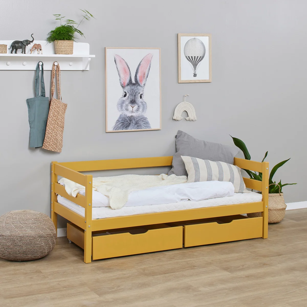 Deze ruime lades in de kleur Autumn Yellow van Hoppekids zijn perfect voor het opbergen van beddengoed of speelgoed. De lades zijn uitgerust met praktische rubberen wielen, waardoor ze gemakkelijk onder het bed vandaan kunnen worden getrokken.