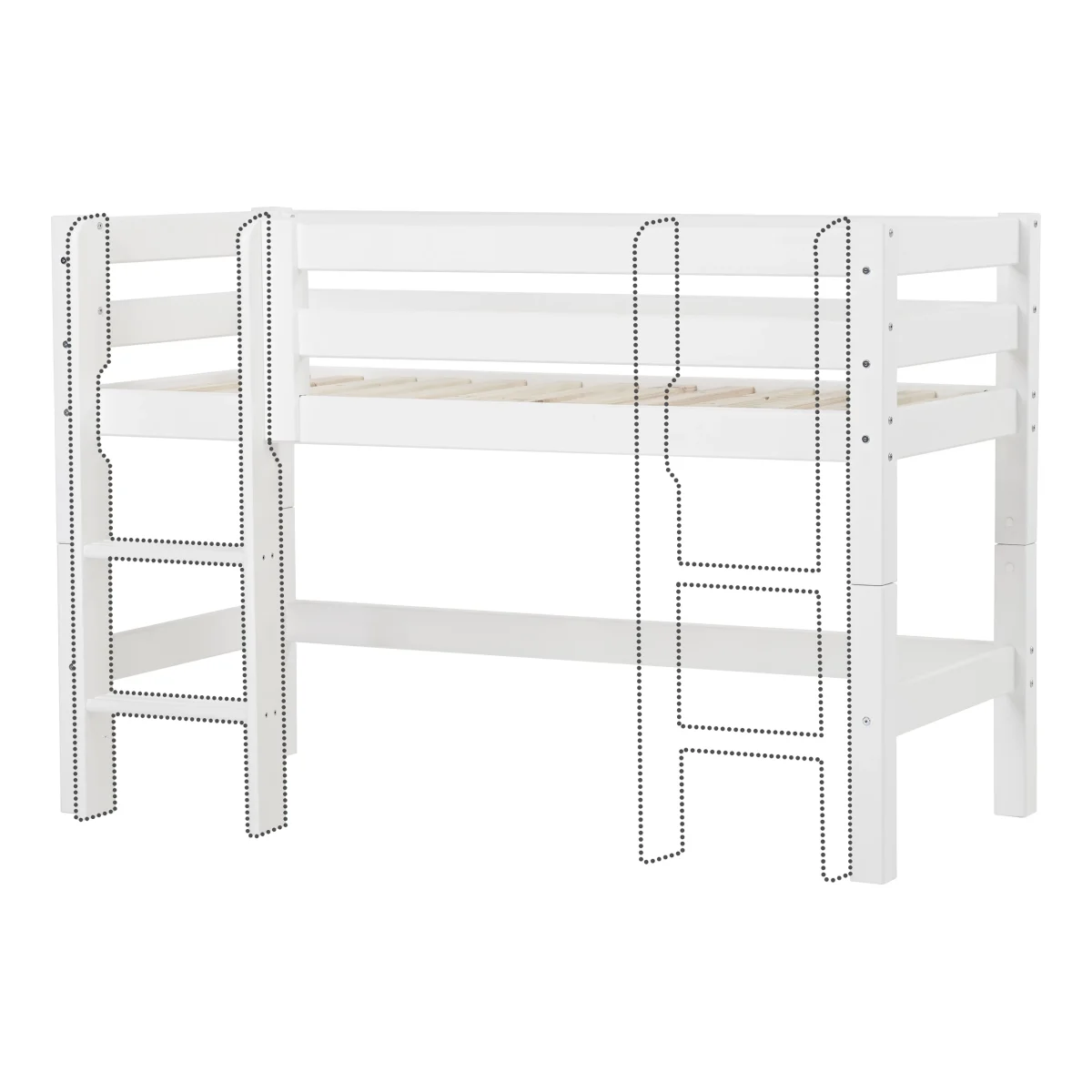 De ladder kan aan de linker- of rechterkant van het bed worden gemonteerd.