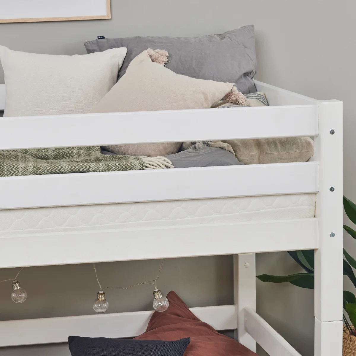 Onder het bed vind je veel ruimte voor opslag of extra vloerruimte. Als je een gordijn aan het bed hangt, kun je de gezelligste kleine grot creëren – en deze misschien versieren met sprookjesachtige verlichting, mooie afbeeldingen, een matras, kussens en meer.