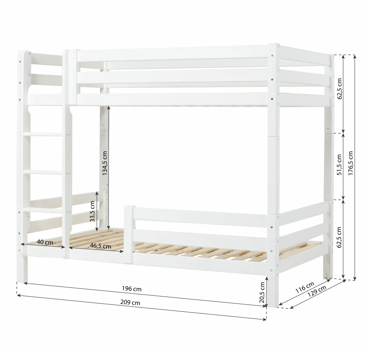 Compleet ECO Luxury stapelbed met extra hoogte en rechte ladder, maat 120×200 cm van Hoppekids. Er is 105 cm ruimte tussen de twee stapelbedden. Dit bed geeft je meer vloerruimte in een gedeelde kamer omdat je twee stapelbedden krijgt voor de ruimte van één.