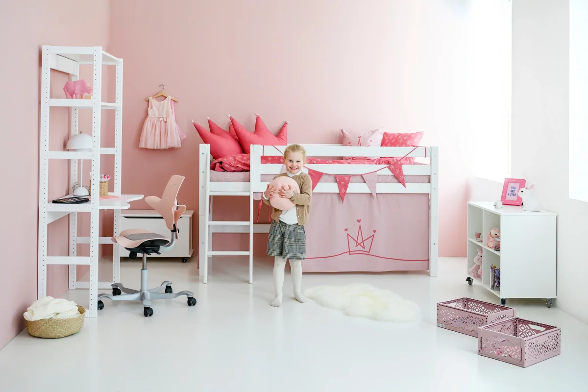 De vlaggenlijn van HOPPEKIDS is bijna twee meter lang! Als een geweldig decoratief element mag het niet ontbreken in geen enkele kinderkamer. Ze kunnen aan het bed, aan de muur worden bevestigd of vrij aan het plafond hangen. De wimpelketting is gemaakt van 100% katoen en is wasbaar op 30 ° Celsius. Pale Rose en Baroque Rose zijn de twee trendkleuren voor prinsessen over de hele wereld. Eén krachtig, de ander delicaat en samen als een toon-op-toon concept in de Hoppekids PRINCESS-collectie, onverslaanbaar. Voeg het lijntekenen met de kroon toe en we hebben een modern ontwerpklassiek voor de kinderkamer. Eenvoudig, elegant en toch onmiskenbaar met een kinderlijke speelsheid, zodat de kinderkamer meteen gezellig aanvoelt. Of het nu gecombineerd wordt met gekleurde bedden of met klassieke witte kinderbedden, PRINCESS ziet er altijd geweldig uit. De kussens, het huisbeddensprei, de gordijnen en de speeltunnel passen allemaal perfect bij elkaar. Een klein universum voor jouw prinses.