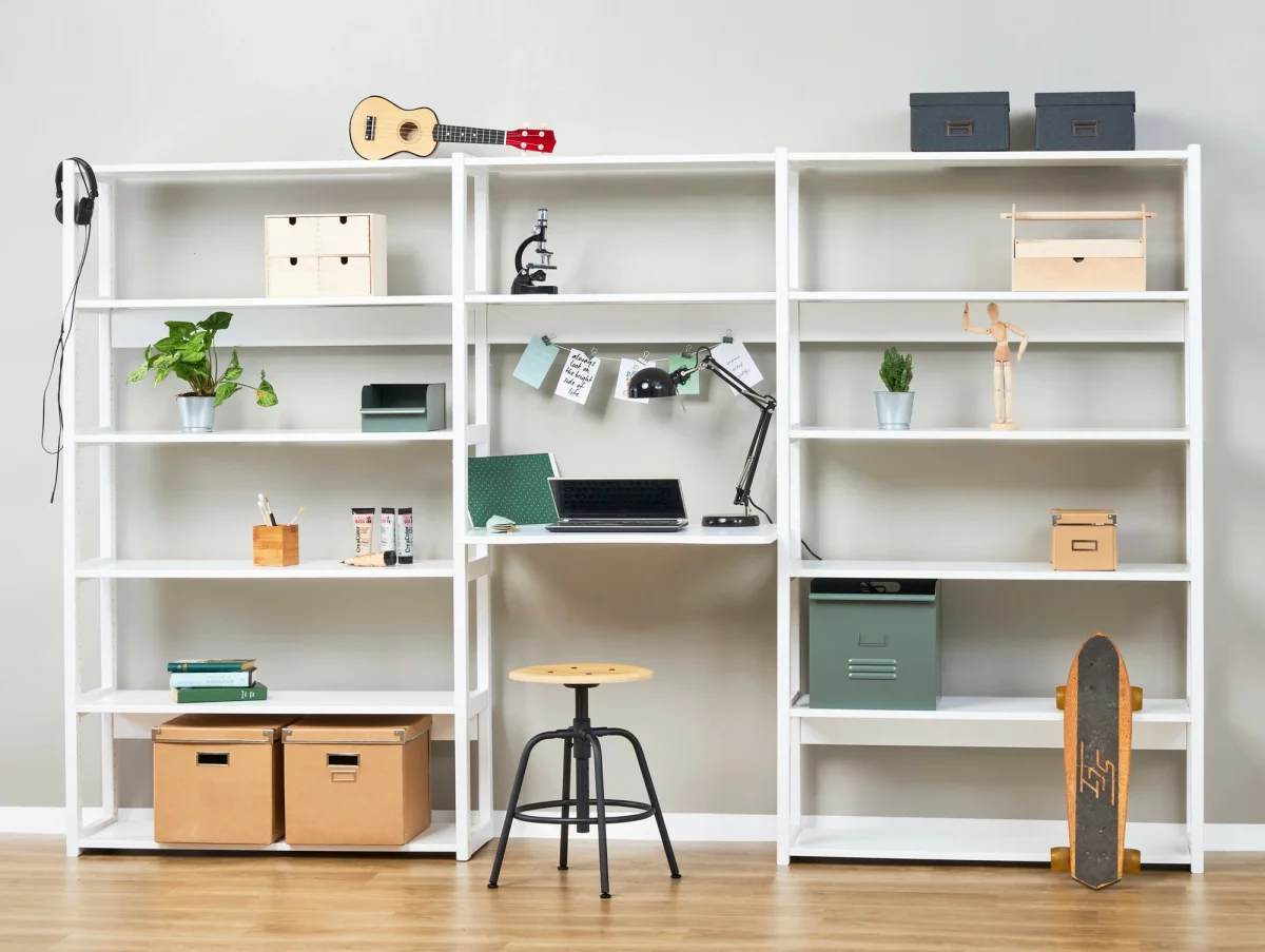 Kast met drie secties met 14 planken en een bureaublad voor het opbergsysteem STOREY van Hoppekids.