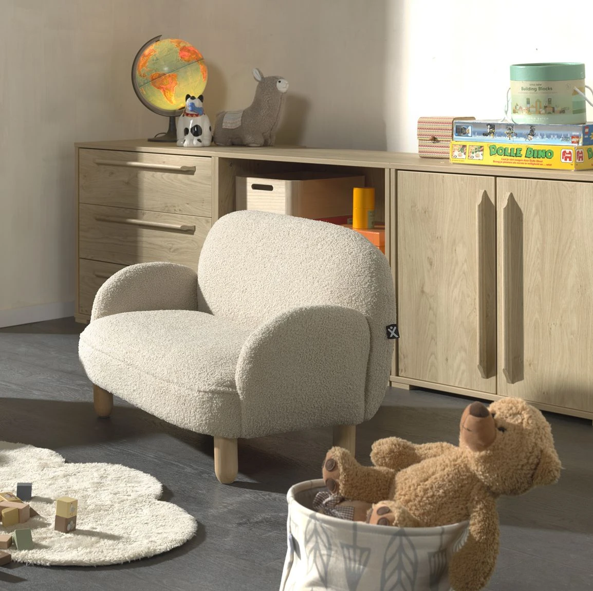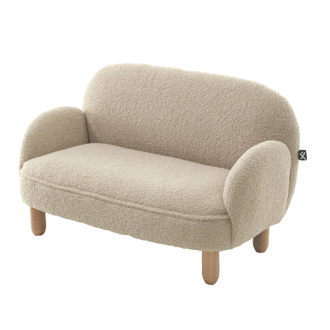 Het kinderbankje uit de ROCKY collectie in beige bouclé is een charmante en comfortabele toevoeging aan de kinderkamer. De zachte stof en afgeronde vormen zorgen voor een warme en uitnodigende uitstraling. Dankzij de twee zitplaatsen kunnen kinderen samen lezen, spelen of ontspannen. De stevige houten poten geven het bankje stabiliteit en een natuurlijke touch. Dit stijlvolle meubelstuk past perfect in de baby- of kinderkamer, maar voelt zich ook thuis in de woonkamer, waar je kleintje zijn eigen gezellige plek heeft om samen met vriendjes of broertjes en zusjes te genieten.