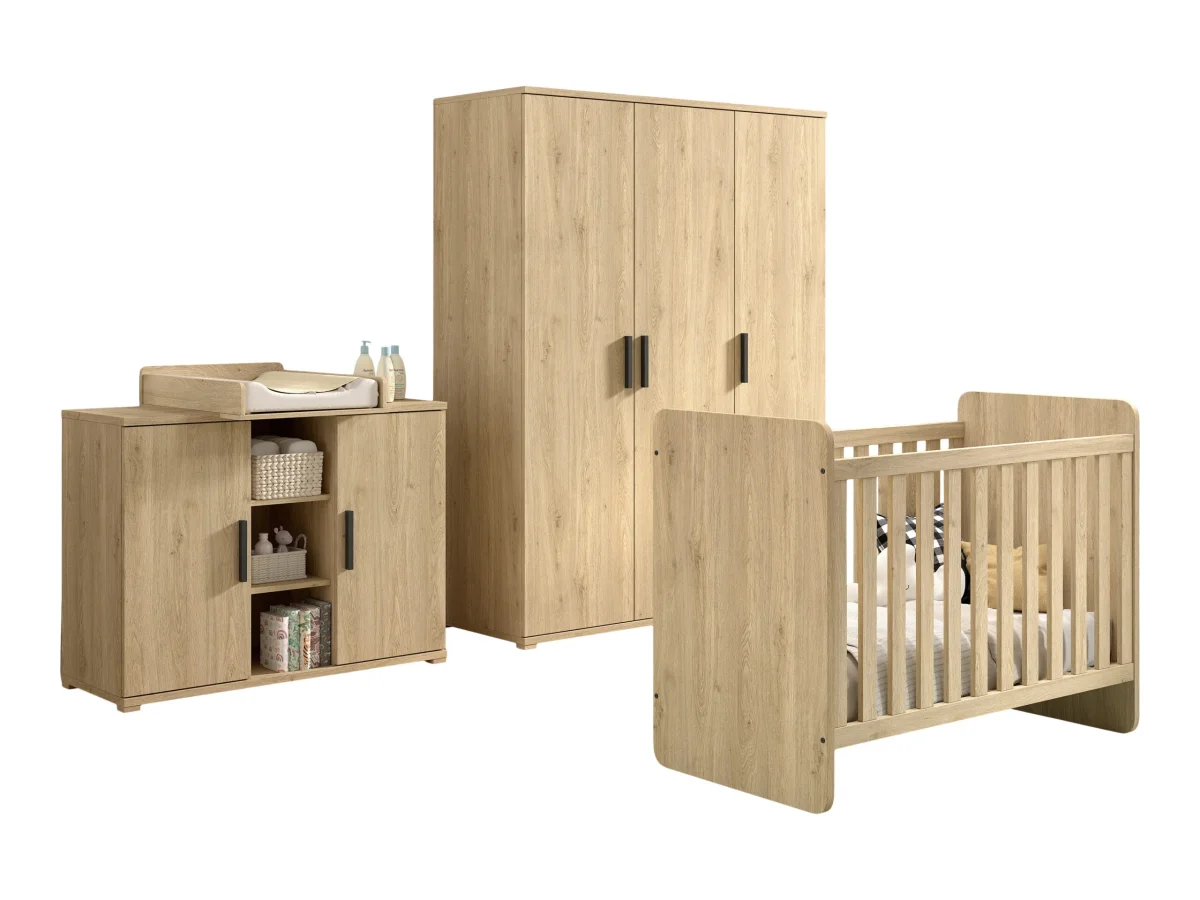 Deze 3-delige Sam meegroeikamer XL van Jaxx in eikenlook bestaat uit een meegroei-ledikant, commode met bladvergroter en 3-deurs kledingkast. Het bedje heeft een matrasmaat van 60×120. De bodem is te verstellen in verschillende hoogtes. Wanneer je kind groeit, groeit het bed mee. Het bed is namelijk om te bouwen tot eenpersoonsbed. Je hoeft tegen die tijd enkel nog een lattenbodem en matras te bestellen. De rest van de onderdelen zijn inbegrepen. Bij het babybed is de bodem dus wel inbegrepen. De commode is voorzien van 2 deurtjes en een open vak met legplank. Ook krijg je er een bladvergroter bij welke je optioneel kunt monteren. De kledingkast beschikt over meerdere legplanken en een kledingroede.