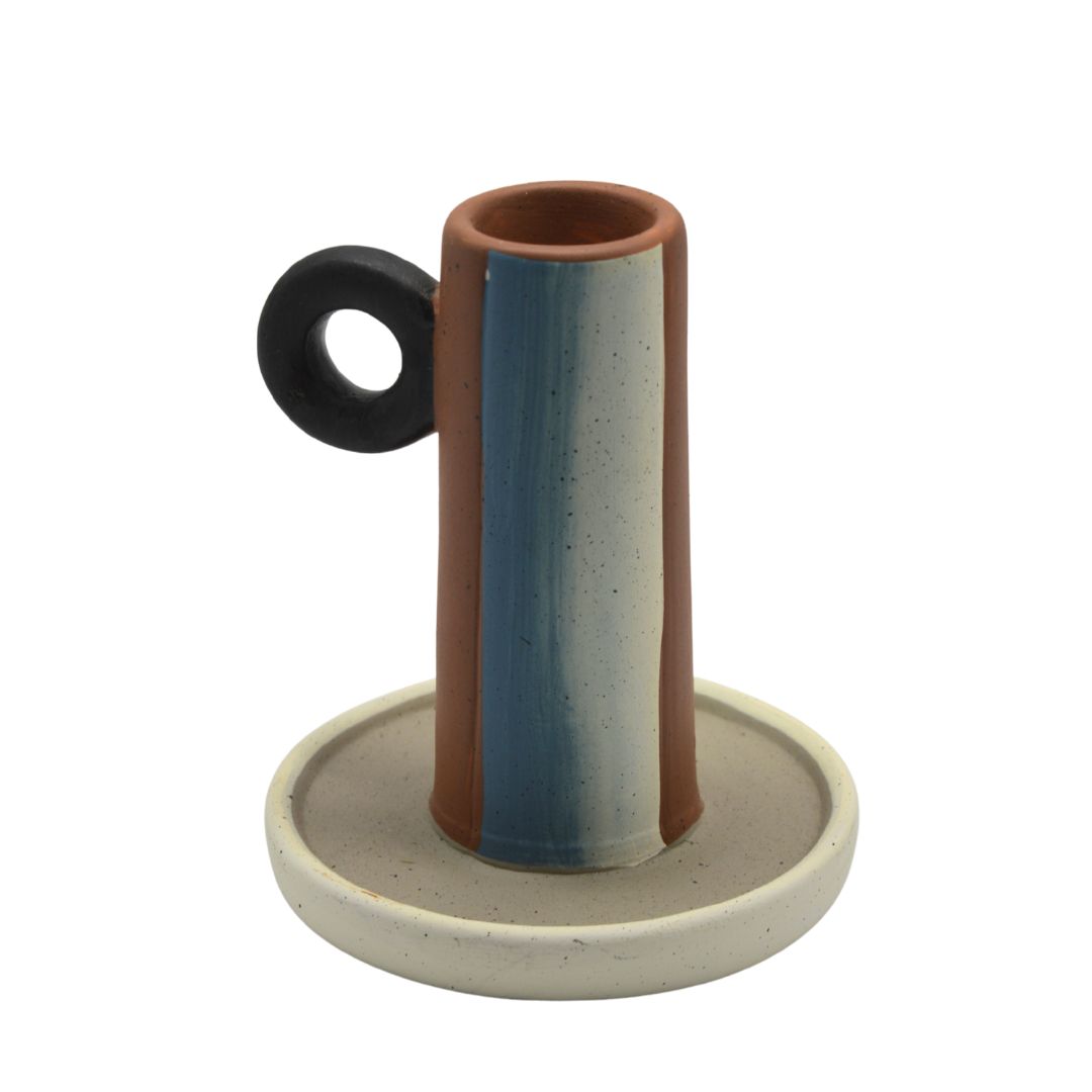 Bijzondere keramieken kandelaar. De onderkant bestaat uit twee kleuren naturel, de kandelaar zelf is terra kleurig met verschillende kleuren. Voorzien van een zwart oor, als een mooi statement. De kleine kaarsjes die ook op de site staan passen hier prima in.