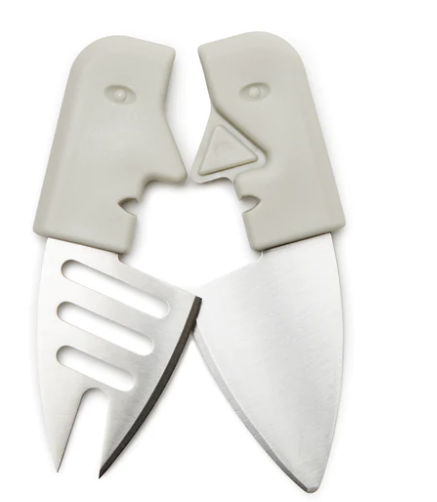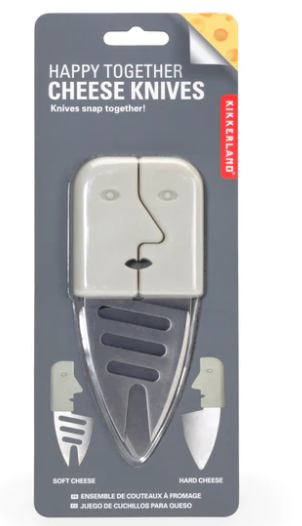 Set van twee kaas mesjes die samen 1 geheel vormen, happy together. Een erg leuk cadeautje voor een stel dat gaat trouwen, samen wonen of wat al niet meer. Het ene mesje is voor harde kaas de andere voor zachtere. Ideaal voor een gezellige en lekkere avond.