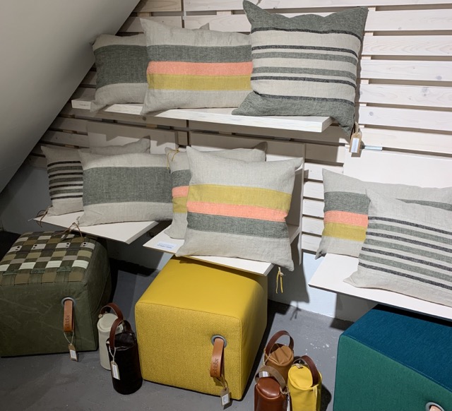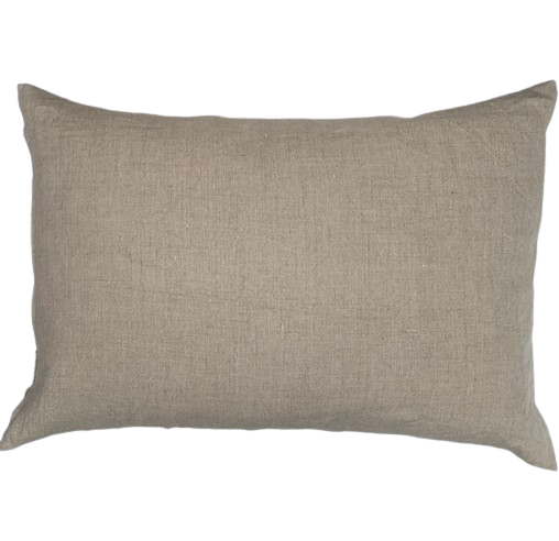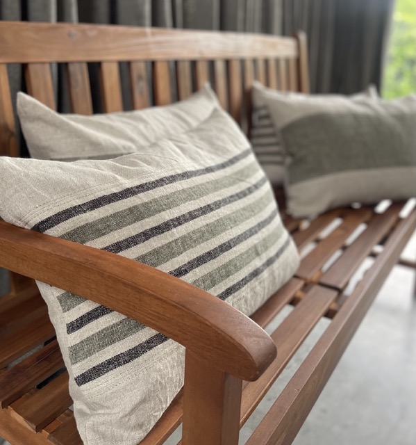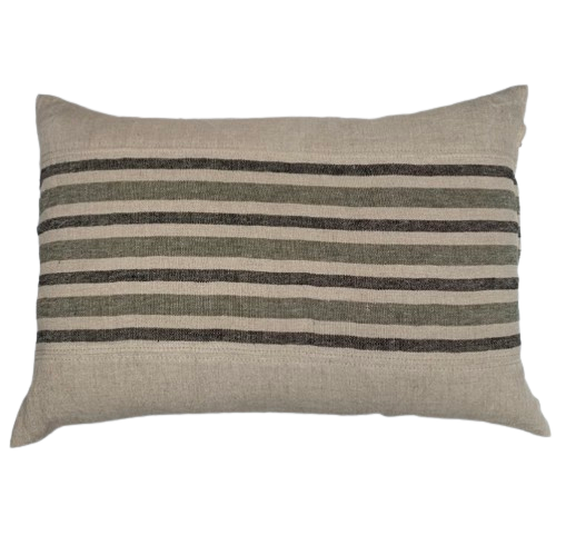 Bijzonder mooi handgemaakt linnen kussen, voorzijde met groene en zwarte strepen, achterzijde naturel, binnenkussen gevuld met donsveren.