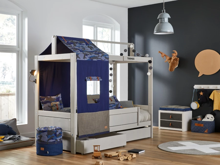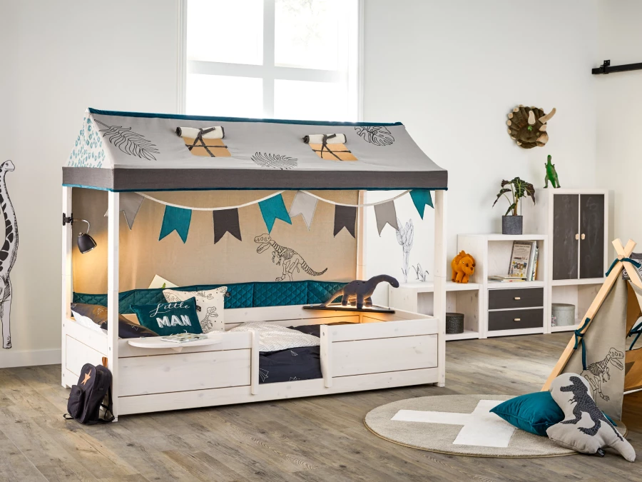 Wil jij als ouder in één klaar zijn? Dan is dit Lifetime 4-in-1 bed met dak iets voor jullie. Door deze set te bestellen heb je direct vier soorten bedden voor elke levensfase van je kind. Het bed is gemaakt van massief grenenhout (FSC gecertificeerd) en afgewerkt met whitewash lak op waterbasis. Een lattenbodem is inbegrepen en een matras is gemakkelijk mee te bestellen. Daarnaast zijn er diverse accessoires beschikbaar. Deze vind je hierboven. Ook kun je verschillende doeken voor het dak en speelgordijnen bestellen. Deze vind je hier.