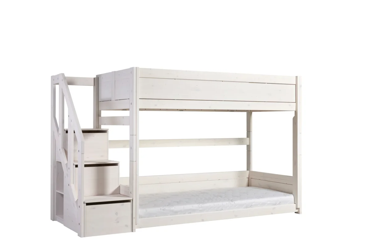 Het stapelbed blijft een slimme, ruimtebesparende en functionele oplossing, of uw kinderen nu een kamer delen of graag samen slapen. Het bed is uitgerust met een slimme trap die extra veiligheid biedt bij het betreden van het bovenste bed. Bovendien biedt deze stevige en stoere trap voldoende opbergruimte, want elke trede heeft ruimte voor speelgoed en andere leuke spullen.