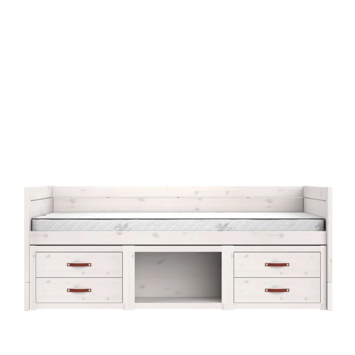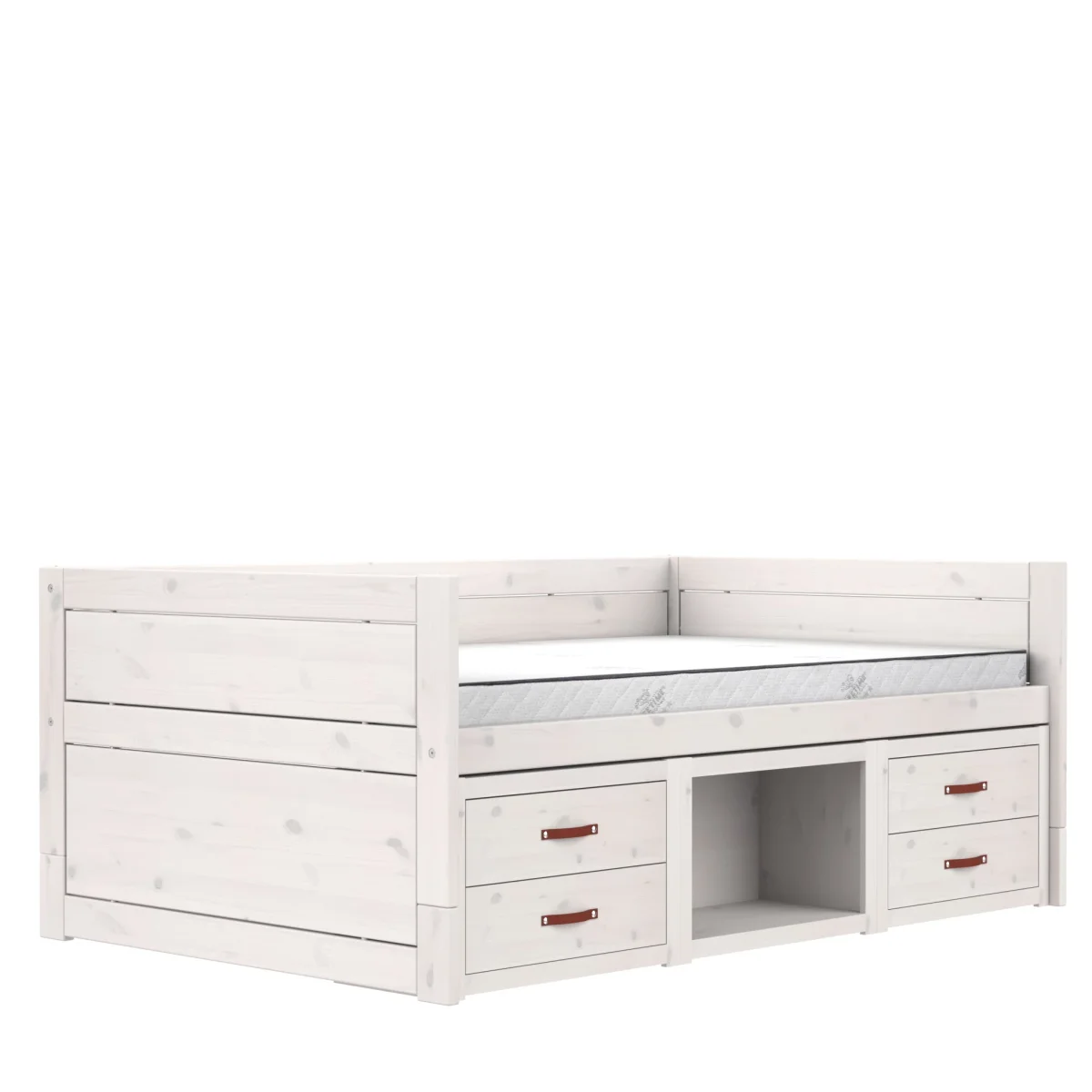 De Lifetime Original bedbank met opbergkastjes in de kleur whitewash is perfect als je kind toe is aan een groter bed en je de ruimte onder het bed optimaal wilt benutten. Onder het bed zitten drie boekenkastjes waarvan 2 voorzien zijn van lades. Optimaal dus op spulletjes in op te bergen. Door te kiezen voor een matrasmaat van 120×200 kan het bed zelfs meegroeien tot aan de studententijd. Uiteraard is dit bed ook om te bouwen naar andere type bedden zoals een (half)hoogslaper of stapelbed.