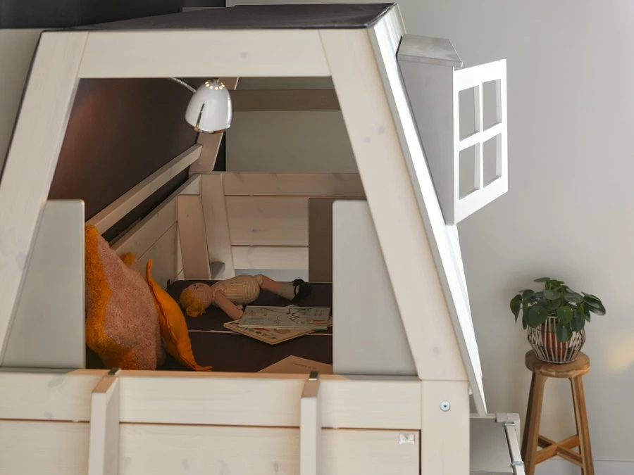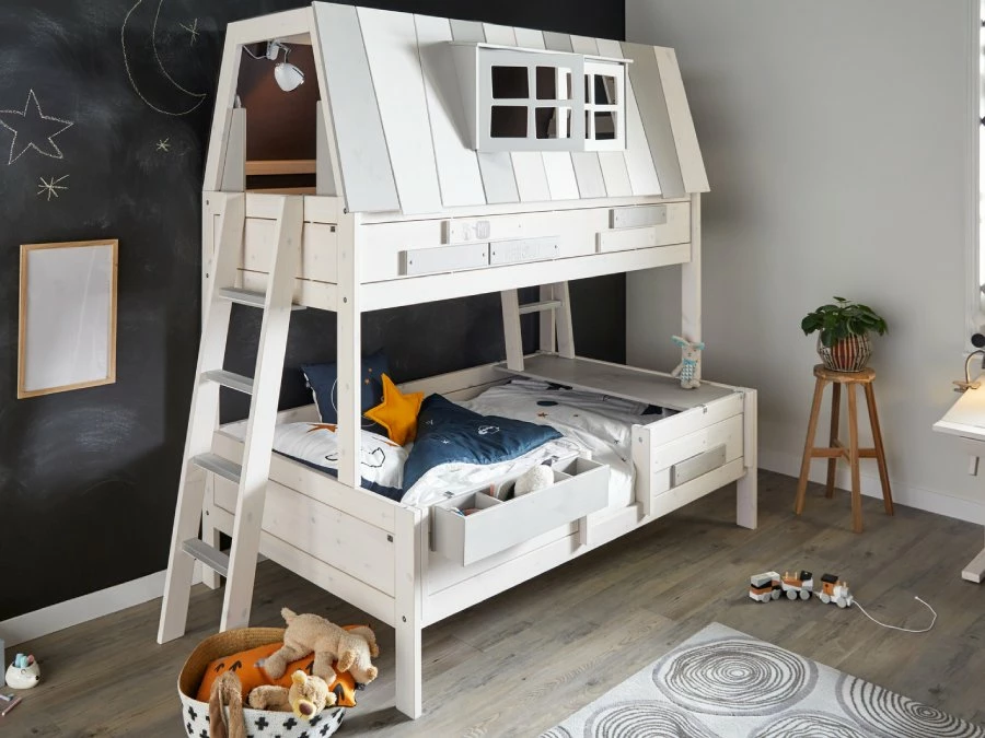 Door dit Lifetime My Hangout stapelbed 90×200 / 140×200 wordt bewezen dat een stapelbed niet enkel functioneel hoeft te zijn. Slapen en logeren wordt zo wel heel leuk. Dit super sterke bed is gemaakt van grenenhout en is afgewerkt met een dekkende witte lak. Het bovenste bed is te bereiken met een ladder aan de kopse kant en dient gelijk ook als chillplek. De raampjes aan de zijkant kunnen open. De matrasmaat van het bovenste bed is 90×200 en de onderste 140×200. Matrassen zijn direct mee te bestellen. De lattenbodems zitten er standaard bij. De ladder kan zowel links als rechts geplaatst worden.