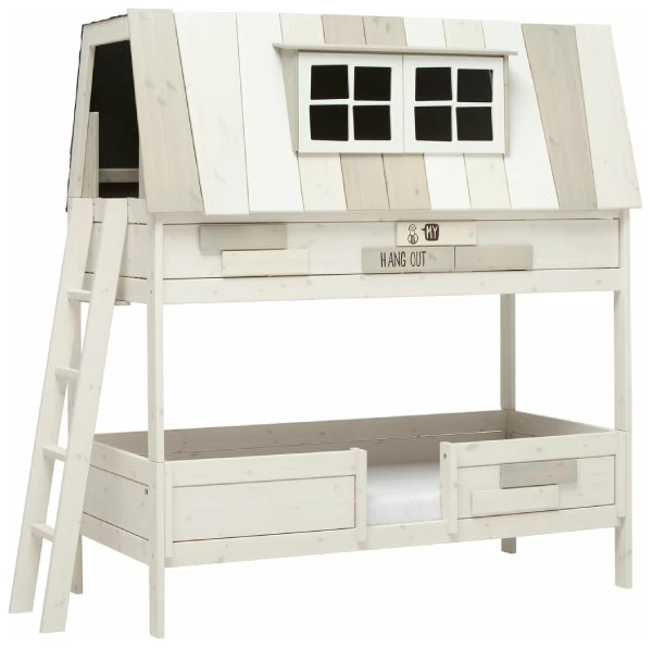 Door dit Lifetime My Hangout stapelbed wordt bewezen dat een stapelbed niet enkel functioneel hoeft te zijn. Slapen en logeren wordt zo wel heel leuk. Dit super sterke bed is gemaakt van grenenhout en is afgewerkt met milieuvriendelijke whitewash lak. Het bovenste bed is te bereiken met een ladder aan de kopse kant en dient gelijk ook als chillplek. De raampjes aan de zijkant kunnen open. De matrasmaat van beide bedden is 90×200. Goede koudschuim matrassen zijn direct mee te bestellen. De lattenbodems zitten er standaard bij. De ladder kan zowel links als rechts geplaatst worden.