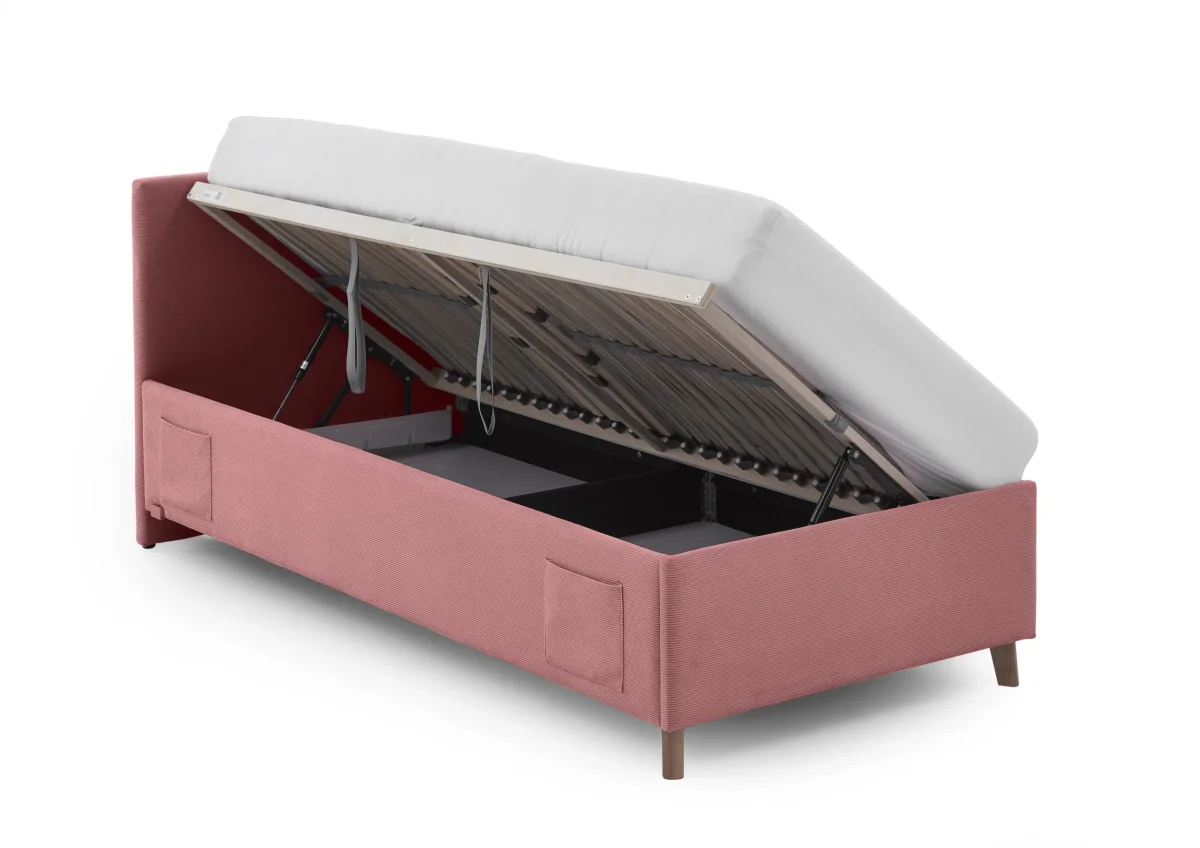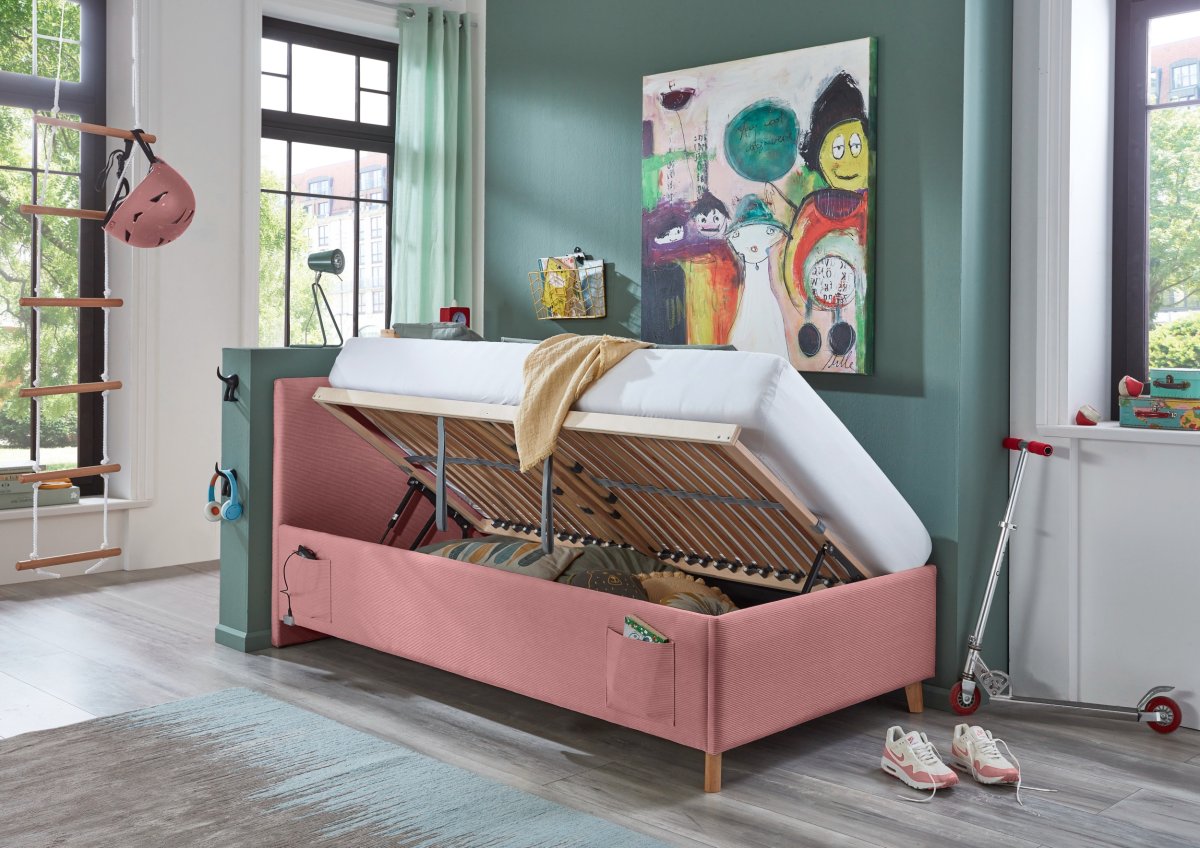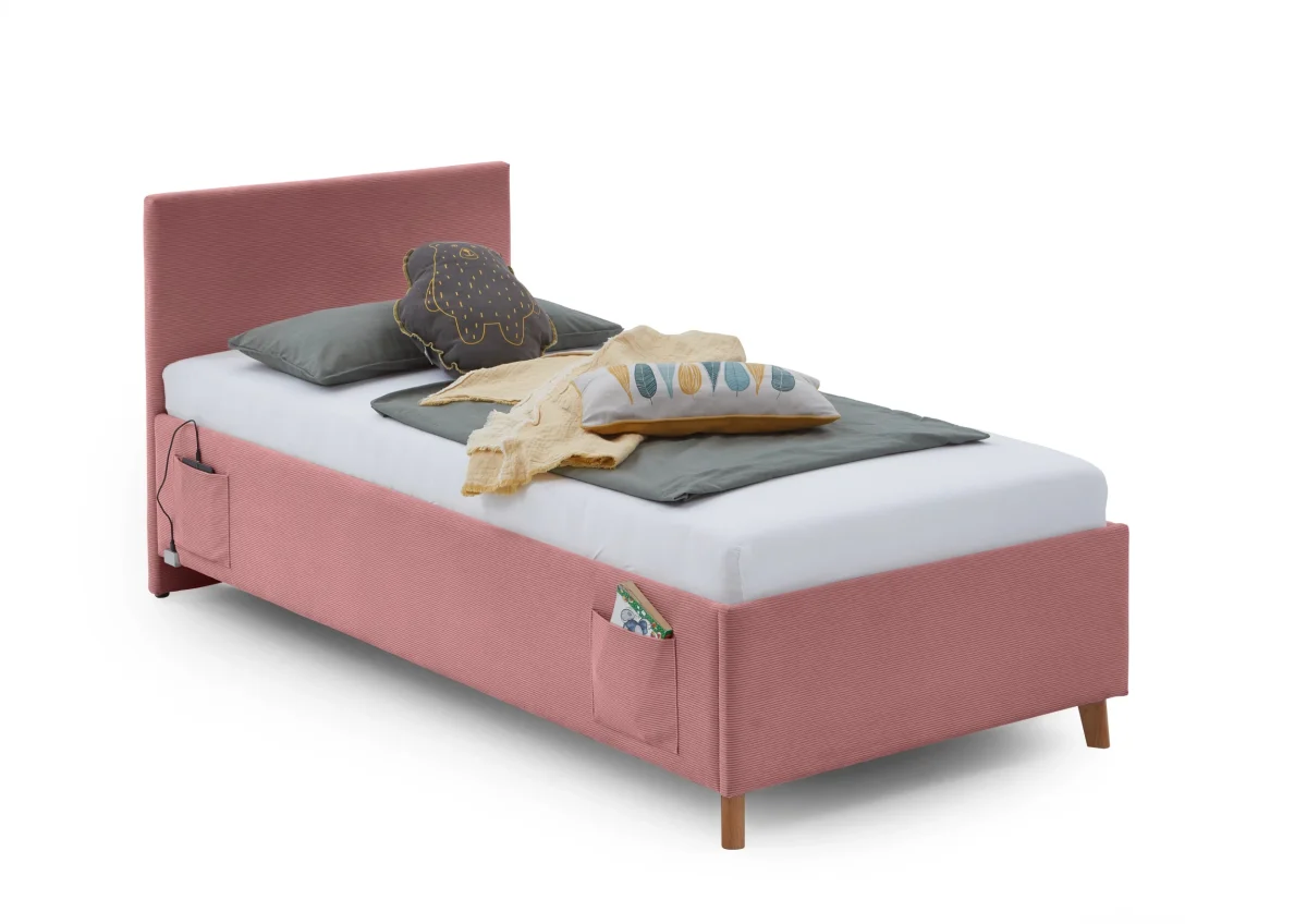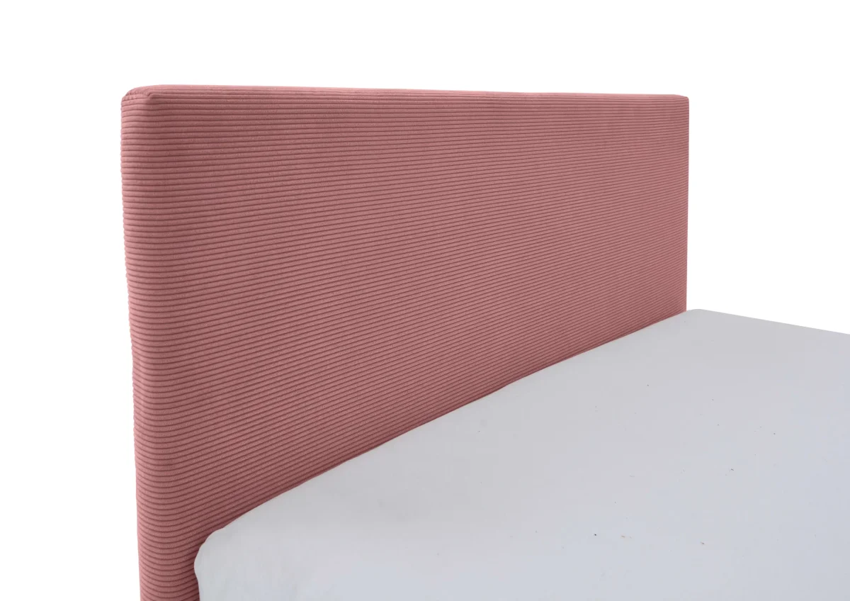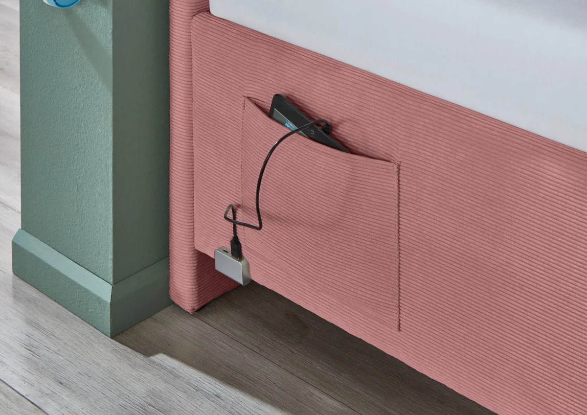 Dit eigentijdse kofferbed in zachtroze ribstof voegt een verfijnde touch toe aan elke slaapkamer. Dankzij de slimme opbergruimte en de geïntegreerde USB-verbinding combineert dit bed moeiteloos design met functionaliteit.