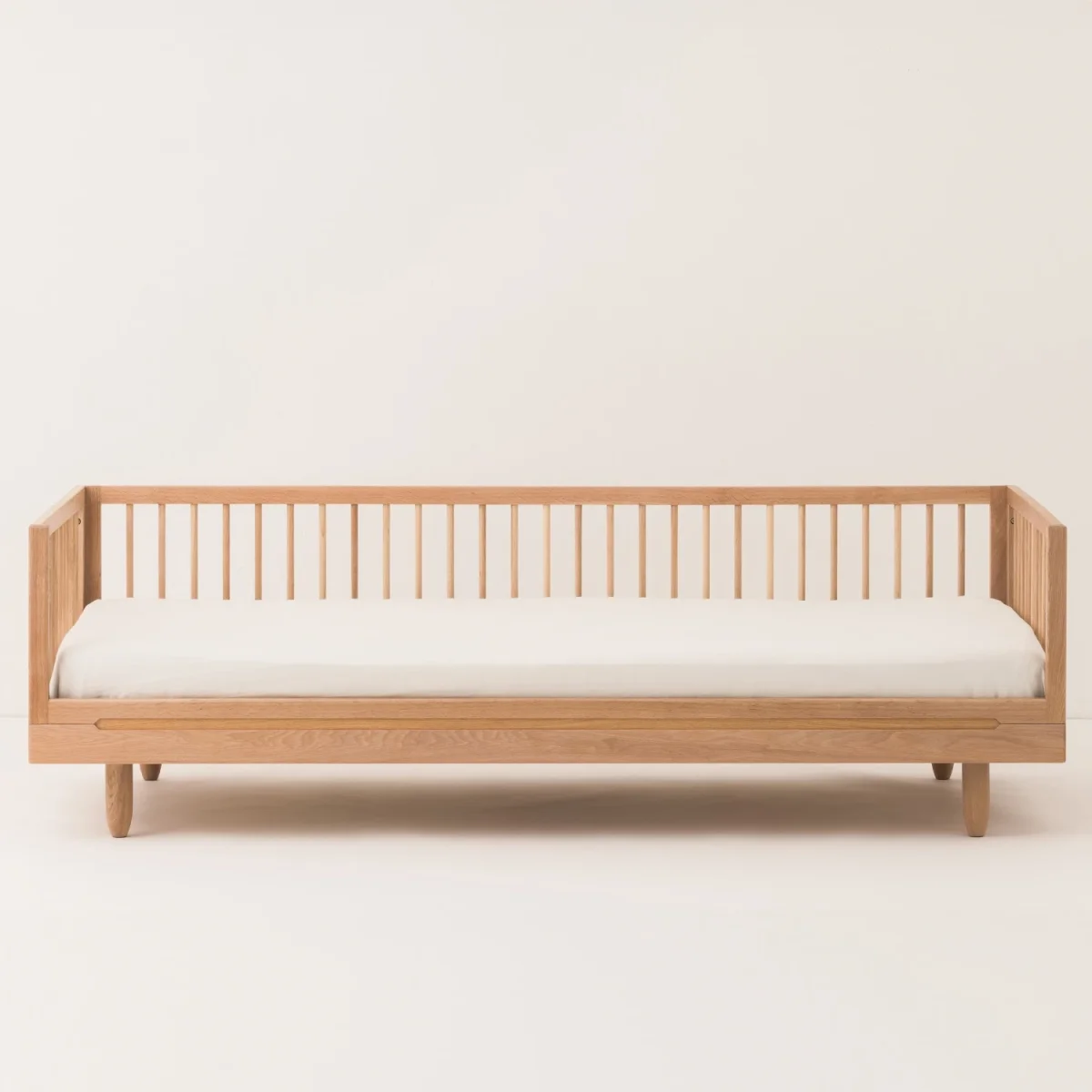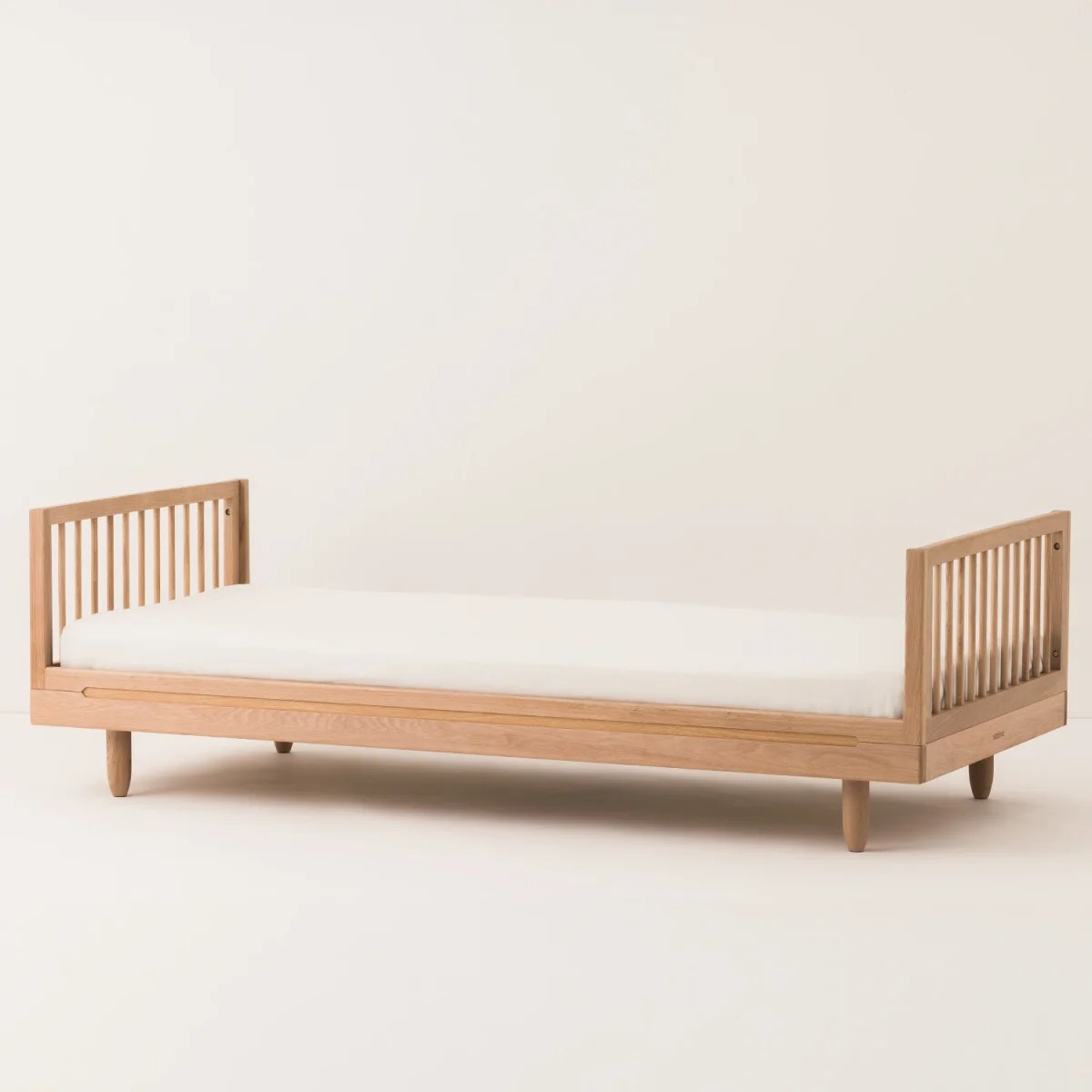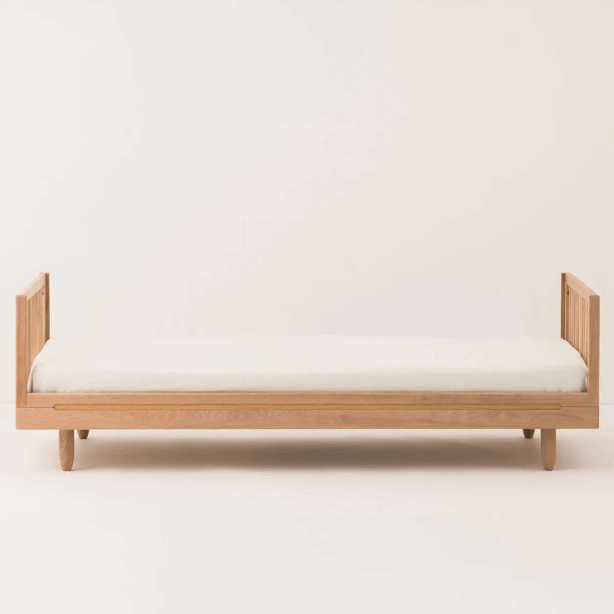 Het Pure eenpersoonsbed, gemaakt van massief Amerikaans eikenhout, is perfect om de kinderkamer te laten uitgroeien tot een elegante en gezellige ruimte. Om nog een stap verder te gaan, kun je het Pure eenpersoonsbed eenvoudig omvormen tot een bedbank door de bedbank-uitbreidingskit mee te bestellen. Van de elegante matte afwerking tot de verfijnde potloodrand en de afgeronde poten in jaren-50-stijl: elk detail is zorgvuldig ontworpen om een onberispelijke kwaliteit te garanderen. Het bed wordt geleverd met een tweekleurige kit, zodat het Pure eenpersoonsbed altijd perfect in jouw interieur past.