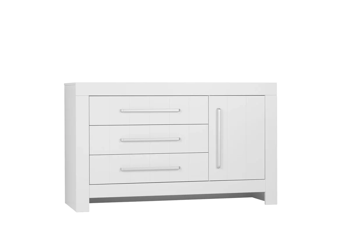 Het strakke ontwerp, de witte kleur en subtiele groeven geven de commode