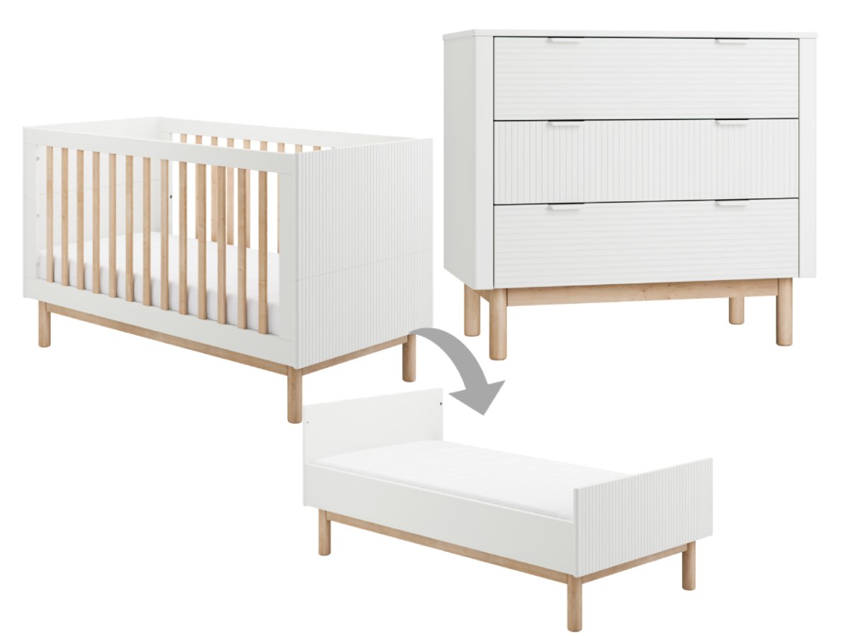 Deze Pinio Miloo 2-delige meegroeikamer in de kleur wit bestaat uit een 70×140 doorbouwbedje en een commode met 3 laden.