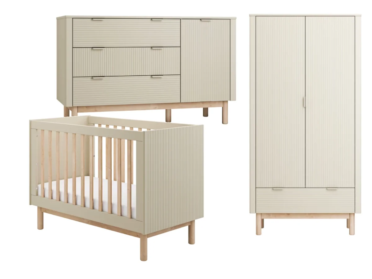Deze Pinio Miloo 3-delige babykamer met grote commode in de kleur Champagne bestaat uit een 60×120 ledikant, een grote commode met 3 laden en 1 deur en een 2-deurs kledingkast.