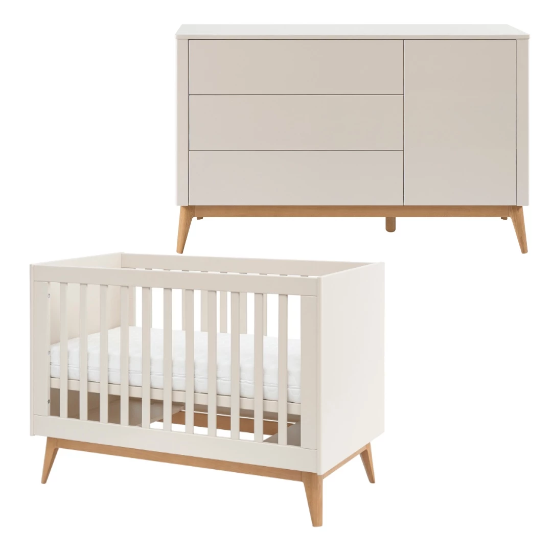 Deze Pinio Seth 2-delige babykamer bestaat uit een ombouwbaar ledikant (60×120) en een XL commode met drie lades en een deurtje.