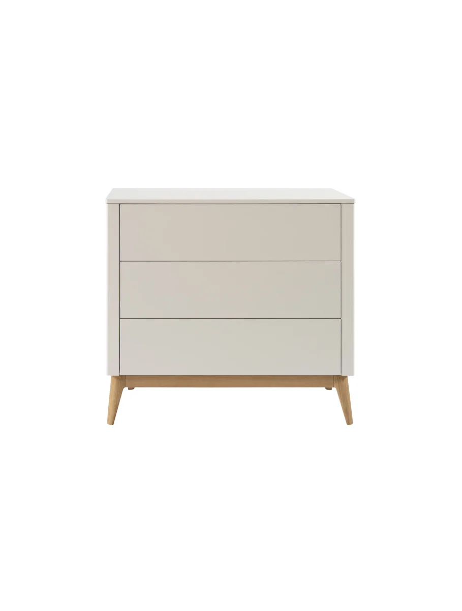 Het strakke ontwerp en de champagnekleurige afwerking geven de commode een moderne en tijdloze uitstraling. De natuurlijke beukenhouten pootjes zorgen voor een warme, elegante touch en maken het geheel luchtig en stijlvol.