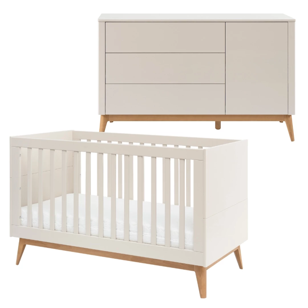 Deze Pinio Seth 2-delige meegroeikamer bestaat uit een doorgroei-ledikant (70×140) en een commode met drie lades en een deurtje.