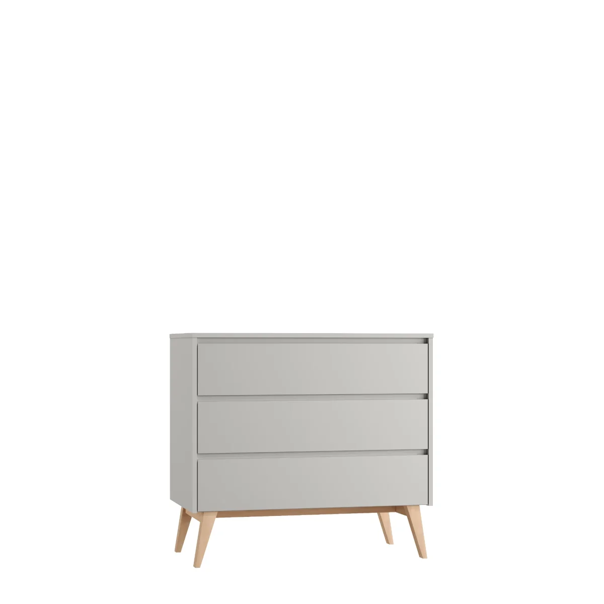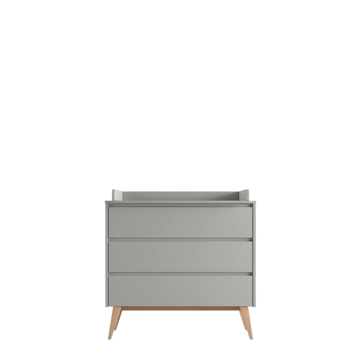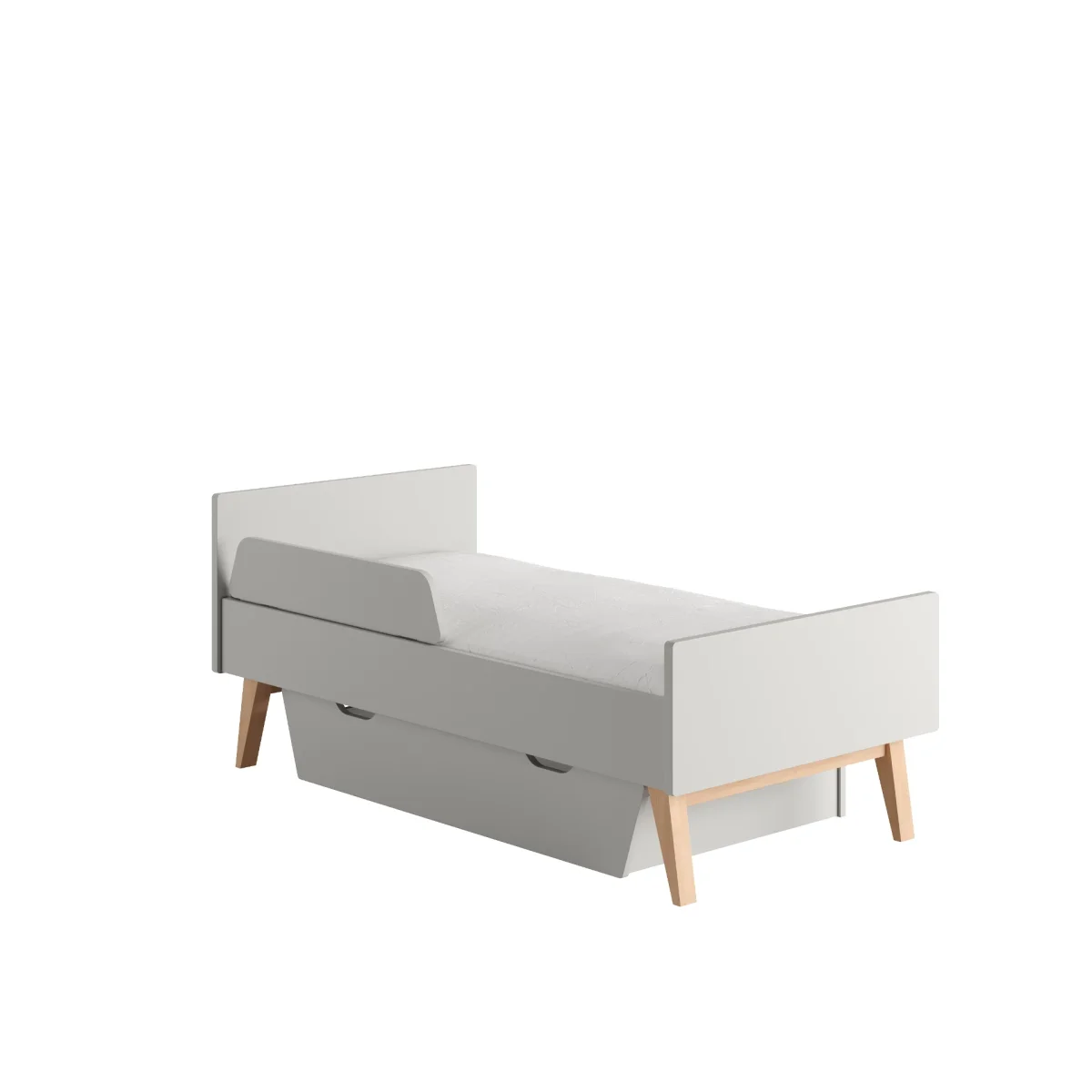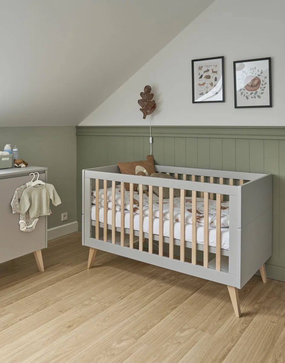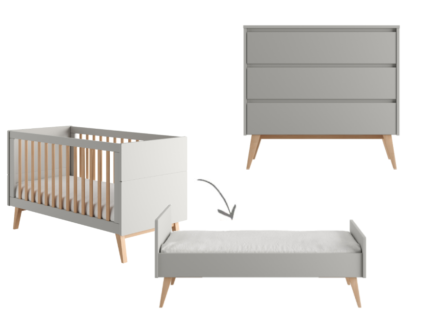 Deze Pinio Swing 2-delige meegroeikamer in de kleur grijs bestaat uit een 70×140 doorbouwbedje en een commode met 3 laden.