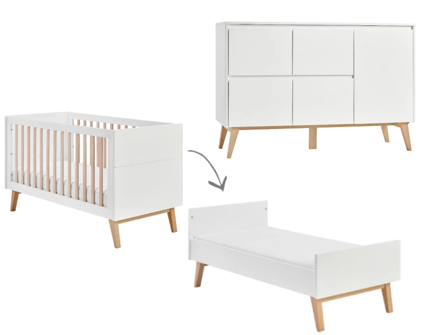 Het ledikant heeft een verstelbare bodem en is om te bouwen naar peuterbed zodat je kind er een lange tijd in kan slapen. De commode heeft 4 ruime laden en een deur met daarachter een legplank. Allen voorzien van soft-close. De deur kan zowel links als rechts geplaatst worden.